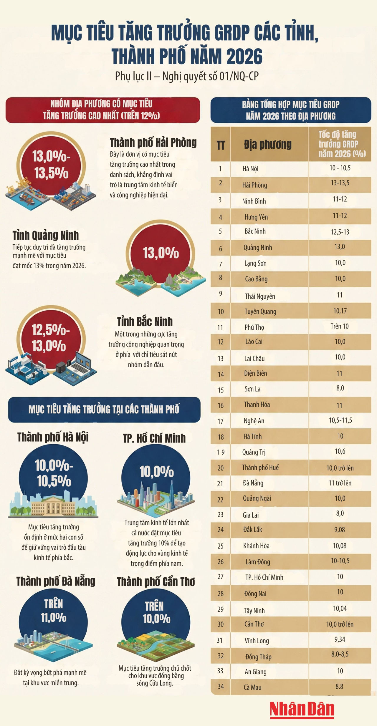 Năm 2026, Hải Phòng dẫn đầu mục tiêu tăng trưởng GRDP cả nước (13-13,5%), theo sát là Quảng Ninh và Bắc Ninh. Các đầu tàu kinh tế như Hà Nội, TP Hồ Chí Minh đồng loạt phấn đấu đạt ngưỡng 10%, khẳng định quyết tâm bứt phá mạnh mẽ của các địa phương trọng điểm theo Phụ lục II Nghị quyết 01/NQ-CP năm 2026 của Chính phủ.