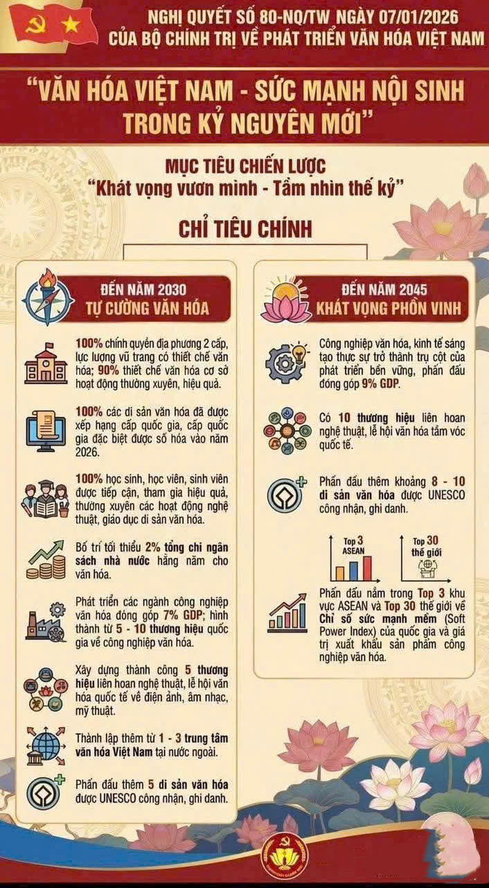 Đất nước bước vào kỷ nguyên phát triển mới, với yêu cầu cấp thiết phải phát huy cao hơn nữa vai trò của văn hóa trong chiến lược phát triển nhanh và bền vững. Ngày 7/1/2026, Bộ Chính trị ban hành Nghị quyết số 80-NQ/TW “Về phát triển văn hóa Việt Nam”, thể hiện bước phát triển về tư duy lý luận và phương thức lãnh đạo của Đảng ta trong lĩnh vực văn hóa, đáp ứng yêu cầu phát triển xứng tầm với nền văn hóa Việt Nam trong kỷ nguyên mới; xác định đầu tư cho văn hóa là đầu tư cho phát triển bền vững đất nước, cho tương lai của dân tộc.
