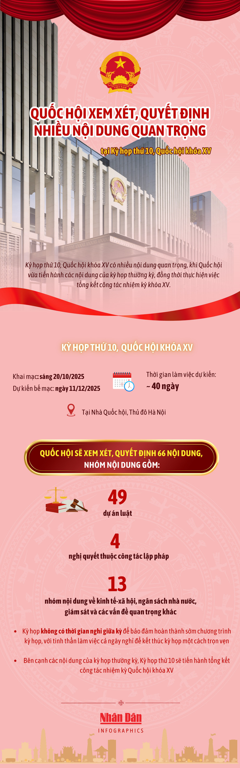 Kỳ họp thứ 10, Quốc hội khóa XV có nhiều nội dung quan trọng, khi Quốc hội vừa tiến hành các nội dung của kỳ họp thường kỳ, đồng thời thực hiện việc tổng kết công tác nhiệm kỳ khóa XV.