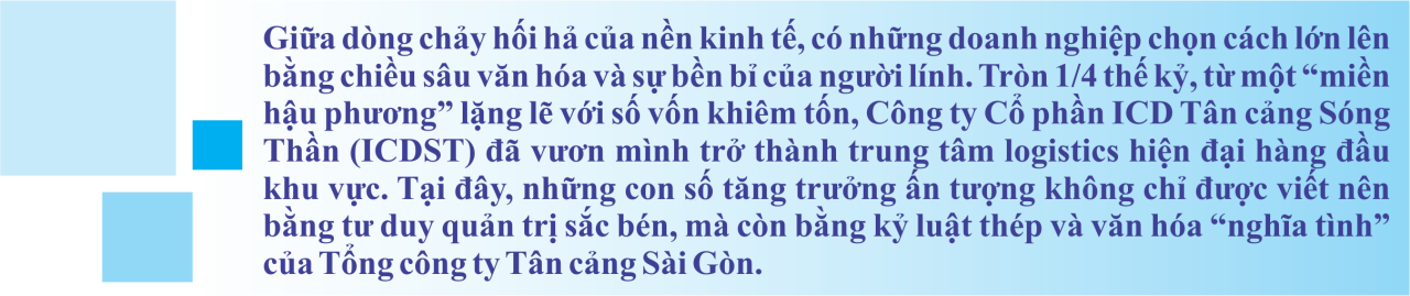 Khi ấy, ICDST mang sứ mệnh thầm lặng: làm “hậu phương” trung chuyển, chia lửa cho hệ thống cảng biển Tân cảng Sài Gòn. Ít ai nghĩ rằng, từ xuất phát điểm khiêm tốn ấy, những người lính làm kinh tế đã từng bước đặt những viên gạch vững chắc cho một hệ sinh thái logistics quy mô sau này. Không ồn ào phô trương, họ chọn sự bền bỉ làm vũ khí, chọn kỷ luật làm điểm tựa để vượt qua những ngày đầu gian khó, từng bước giữ nhịp cho dòng chảy hàng hóa quốc gia.