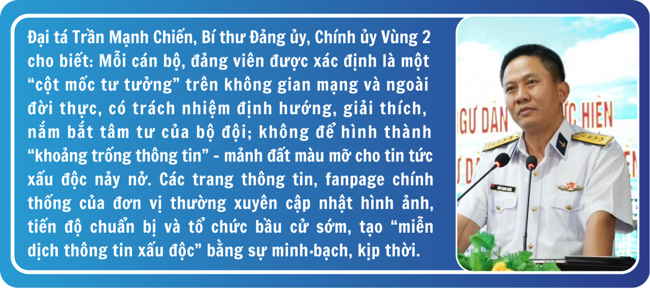 Trên “mặt trận không gian mạng”, lợi dụng việc cán bộ, chiến sĩ trên tàu và nhà giàn đã được kết nối internet qua hệ thống vệ tinh, các đối tượng xấu phát tán tin giả, cắt ghép video, dựng “clip nội bộ”, tung “tin rò rỉ” về nhân sự cấp cao, kích động hoài nghi, chia rẽ niềm tin trước ngày bầu cử. Chúng tìm cách chọc thủng “lá chắn tư tưởng” bằng những thông tin nửa thật, nửa giả, đánh vào tâm lý tò mò, thiếu kiểm chứng. Trước thực tế đó, Vùng 2 Hải quân xác định phải chủ động phòng ngừa hơn là bị động đối phó.