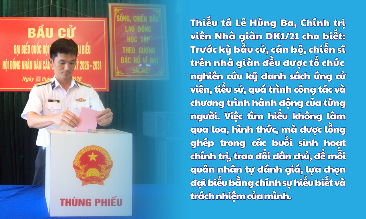 Giữa không gian biển khơi, mỗi điều luật, mỗi nguyên tắc bầu cử được soi chiếu bằng chính thực tiễn trực sẵn sàng chiến đấu và bảo vệ chủ quyền quốc gia. Qua đó, cán bộ, chiến sĩ hiểu sâu sắc rằng, thực hiện quyền bầu cử không chỉ là nghĩa vụ pháp lý mà còn là sự thể hiện danh dự, niềm tin và trách nhiệm đối với Tổ quốc. Chính vì thế, 100% cử tri là quân nhân đều thể hiện tinh thần chủ động, trách nhiệm khi nghiên cứu thông tin ứng cử viên và thực hiện quyền bầu cử của mình.