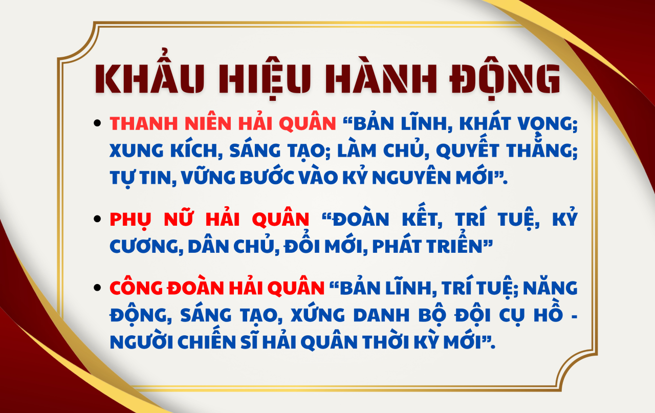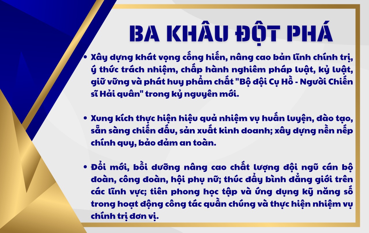 Thứ nhất, tăng cường sự lãnh đạo của cấp ủy, chỉ huy các cấp; quán triệt sâu sắc các nghị quyết, chỉ thị của Đảng, Quân uỷ Trung ương, Bộ Quốc phòng, Tổng cục Chính trị, Đảng ủy, Bộ Tư lệnh Hải quân về công tác thanh niên, phụ nữ, công đoàn và xây dựng các tổ chức quần chúng ngày càng vững mạnh; giáo dục, rèn luyện, phát huy vai trò xung kích, khát vọng cống hiến của đoàn viên thanh niên. Đổi mới mạnh mẽ hơn nữa nội dung, hình thức, phương pháp hoạt động của đoàn thanh niên, hội phụ nữ, công đoàn cơ sở gắn với thực hiện nhiệm vụ chính trị, huấn luyện, sẵn sàng chiến đấu, xây dựng chính quy, chấp hành kỷ luật, nghiên cứu khoa học và lao động sản xuất.