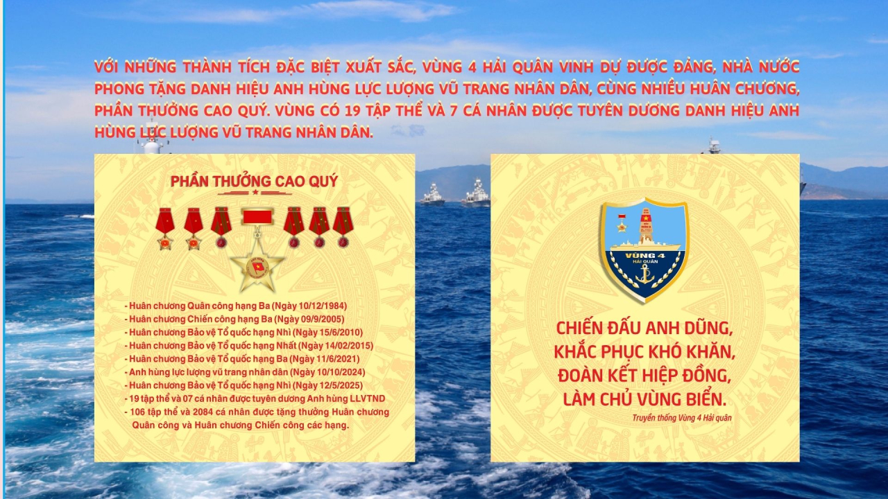 Nửa thế kỷ đã trôi qua, mỗi chiến công, mỗi thành tích của Vùng 4 Hải quân là một biểu tượng sáng ngời của chủ nghĩa anh hùng cách mạng, kết tinh từ mồ hôi, xương máu, ý chí kiên cường và lòng dũng cảm của nhiều thế hệ cán bộ, chiến sĩ. Trải qua 50 năm xây dựng, chiến đấu và trưởng thành, dưới lá cờ vẻ vang của Đảng, Vùng 4 Hải quân đã hun đúc nên truyền thống quý báu: “Chiến đấu anh dũng - Khắc phục khó khăn - Đoàn kết hiệp đồng - Làm chủ vùng biển.”