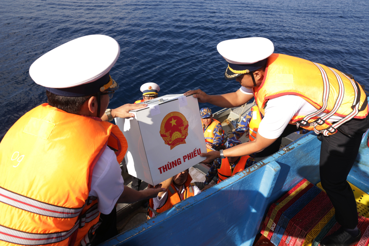 Sau khi hoàn thành bầu cử sớm trên biển, thùng phiếu được đưa từ tàu cá trở lại tàu Hải quân để chuyển về đất liền