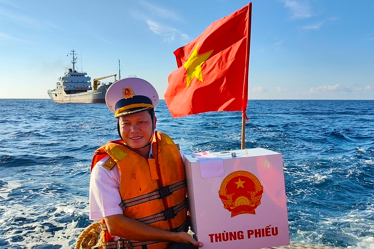 Vượt hơn 1.000 hải lý trong nửa tháng hành trình, tàu Trường Sa 04 và Trường Sa 21 (Vùng 2 Hải quân) mang theo thùng phiếu đến 15 nhà giàn và các điểm bầu cử trên biển