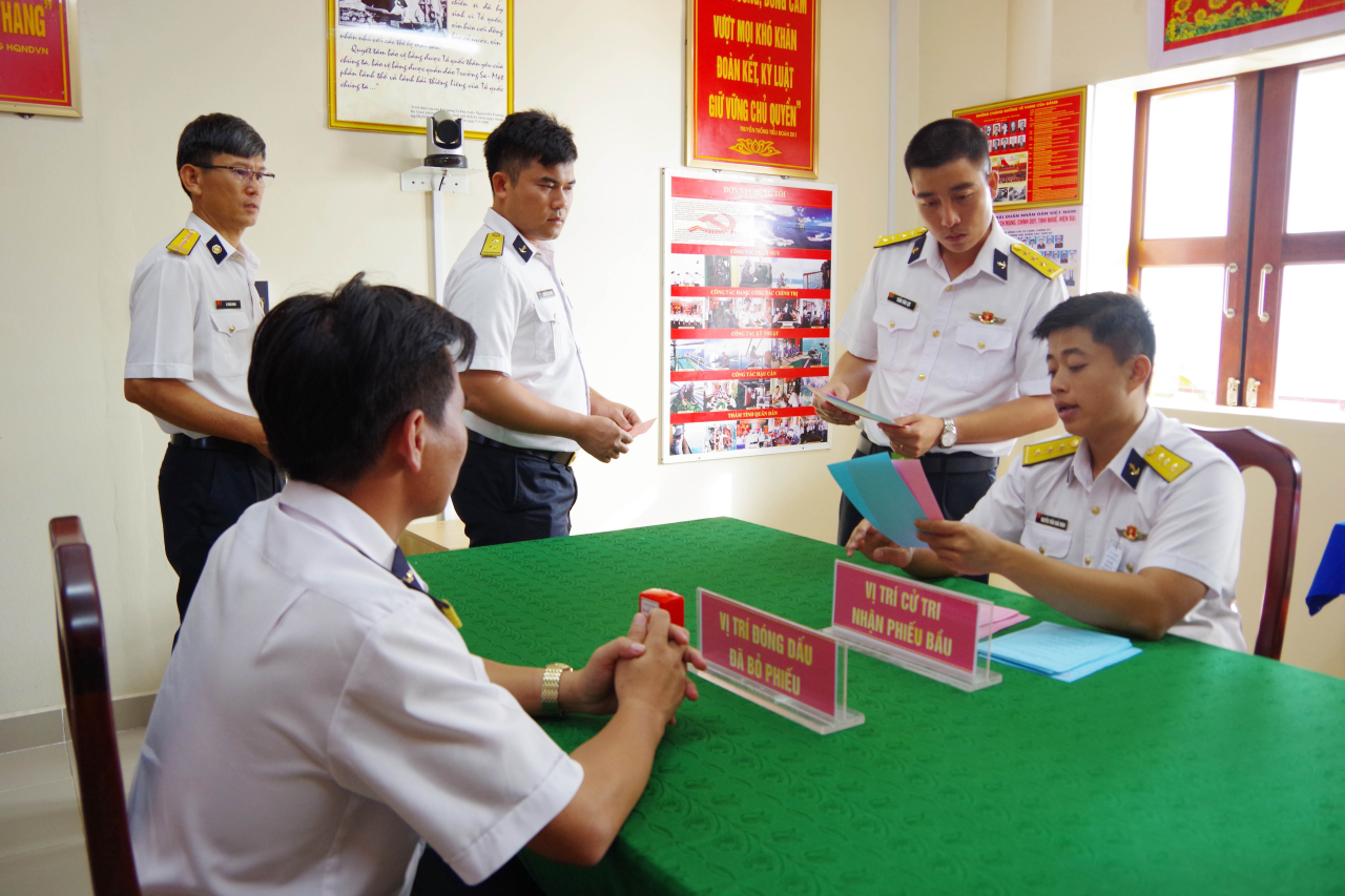 Sau khi rời nhà giàn, đoàn công tác tiếp tục tổ chức bầu cử cho cán bộ, chiến sĩ các tàu Hải quân đang làm nhiệm vụ trên biển