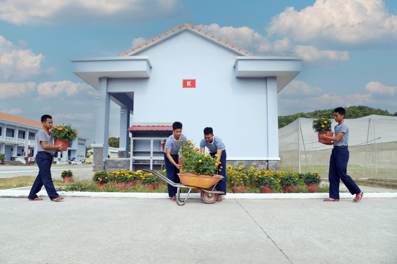 Những chậu hoa do chính tay bộ đội chăm sóc khoe sắc trong nắng xuân, tô điểm thêm sắc màu Tết nơi doanh trại giữa trùng khơi.