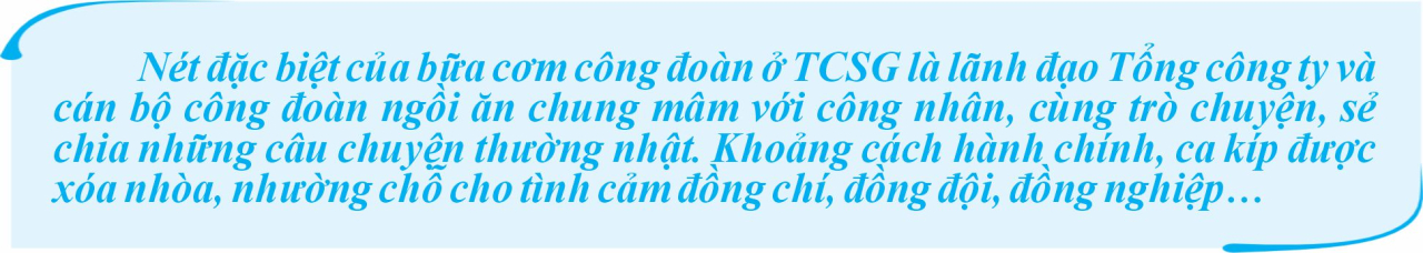Bữa cơm công đoàn chỉ là một phần trong hệ thống phúc lợi rộng lớn của TCSG. Nhiều năm qua, Tổng công ty đã đầu tư hàng trăm tỷ đồng xây dựng, nâng cấp nhà ăn tập thể khang trang, hiện đại; tăng định mức, cải thiện suất ăn trưa, ăn ca; tổ chức khám sức khỏe định kỳ; mua các loại bảo hiểm y tế, xã hội, nhân thọ cho người lao động. Cùng với đó, đơn vị còn quan tâm hỗ trợ, thăm hỏi kịp thời cán bộ, công nhân khi gặp hoàn cảnh khó khăn, mắc bệnh điều trị dài ngày, gặp tai nạn lao động; tổ chức tham quan, du lịch nghỉ dưỡng; thực hiện đầy đủ các chế độ…