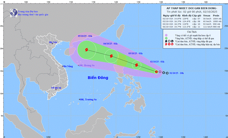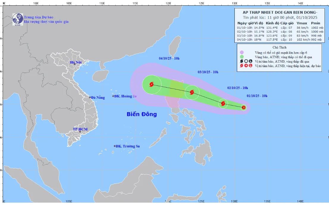 Dự báo đến 10 giờ ngày 2/10, áp thấp nhiệt đới di chuyển theo hướng Tây-Tây Bắc, tốc độ khoảng 15km/giờ và có khả năng mạnh lên thành bão; trên vùng biển phía Đông đảo Luzon có gió cấp 8, giật cấp 10.