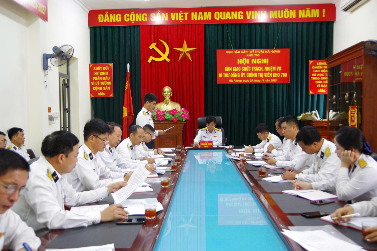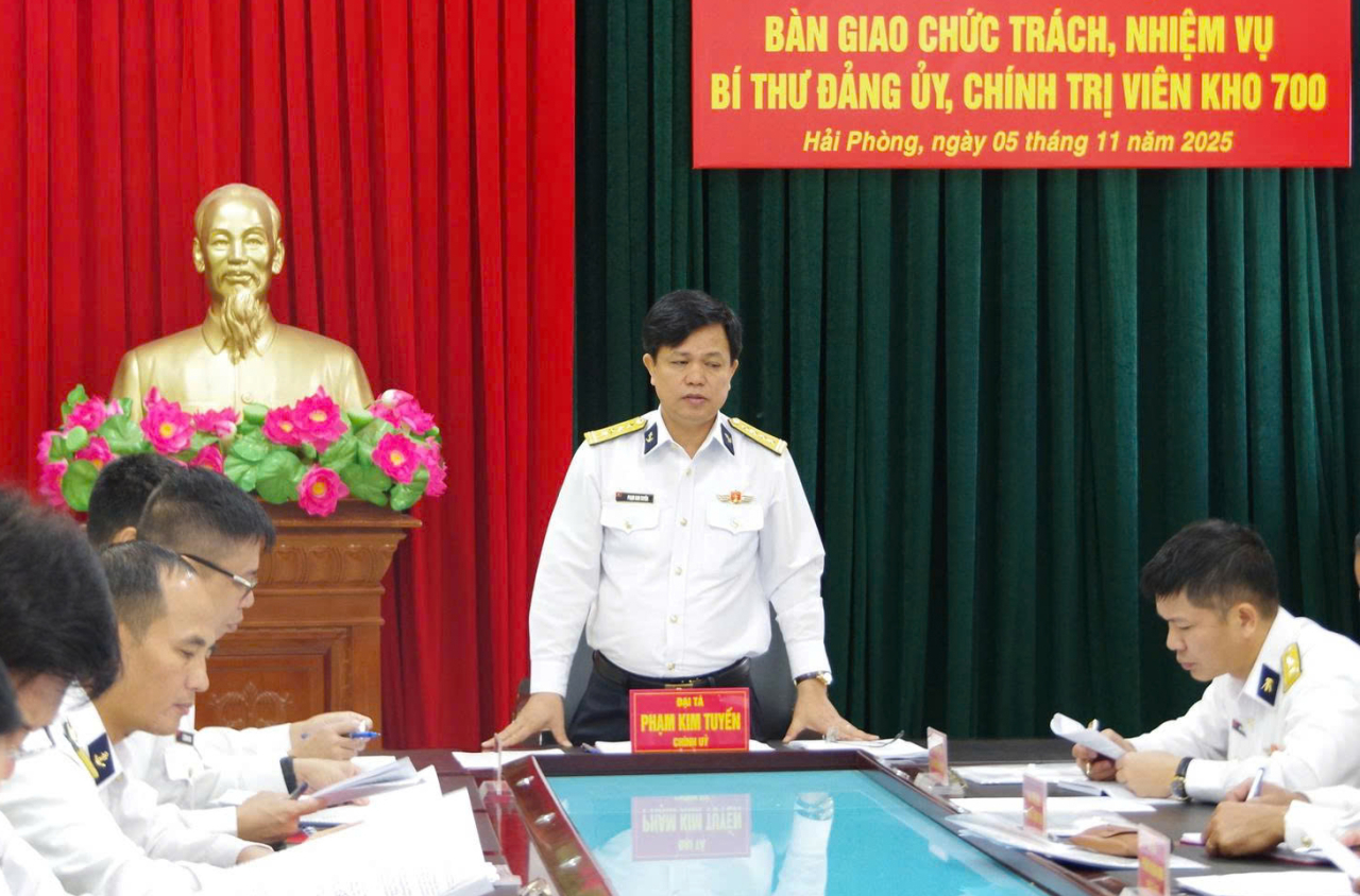 HQ Online - Sáng 5/11, tại Hải Phòng, Kho 700 (Cục Hậu cần-Kỹ thuật Hải quân) tổ chức Hội nghị bàn giao chức trách, nhiệm vụ Bí thư Đảng ủy, Chính trị viên Kho giữa Thượng tá Bùi Đức Thắng và Thượng tá Nguyễn Đức Hạnh. Đại tá Phạm Kim Tuyến, Bí thư Đảng ủy, Chính ủy Cục Hậu cần-Kỹ thuật chủ trì.