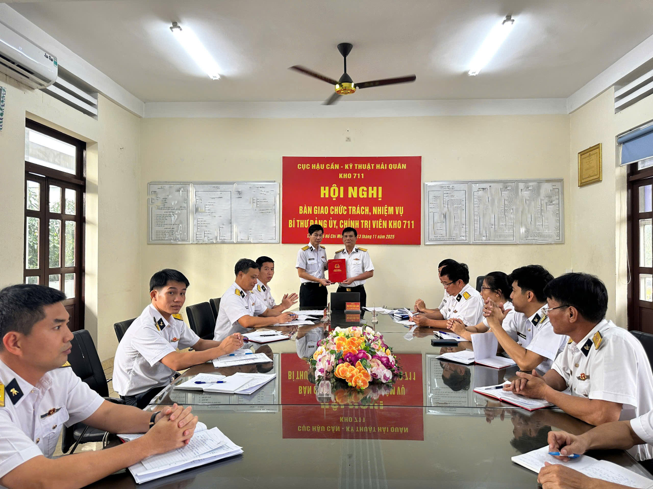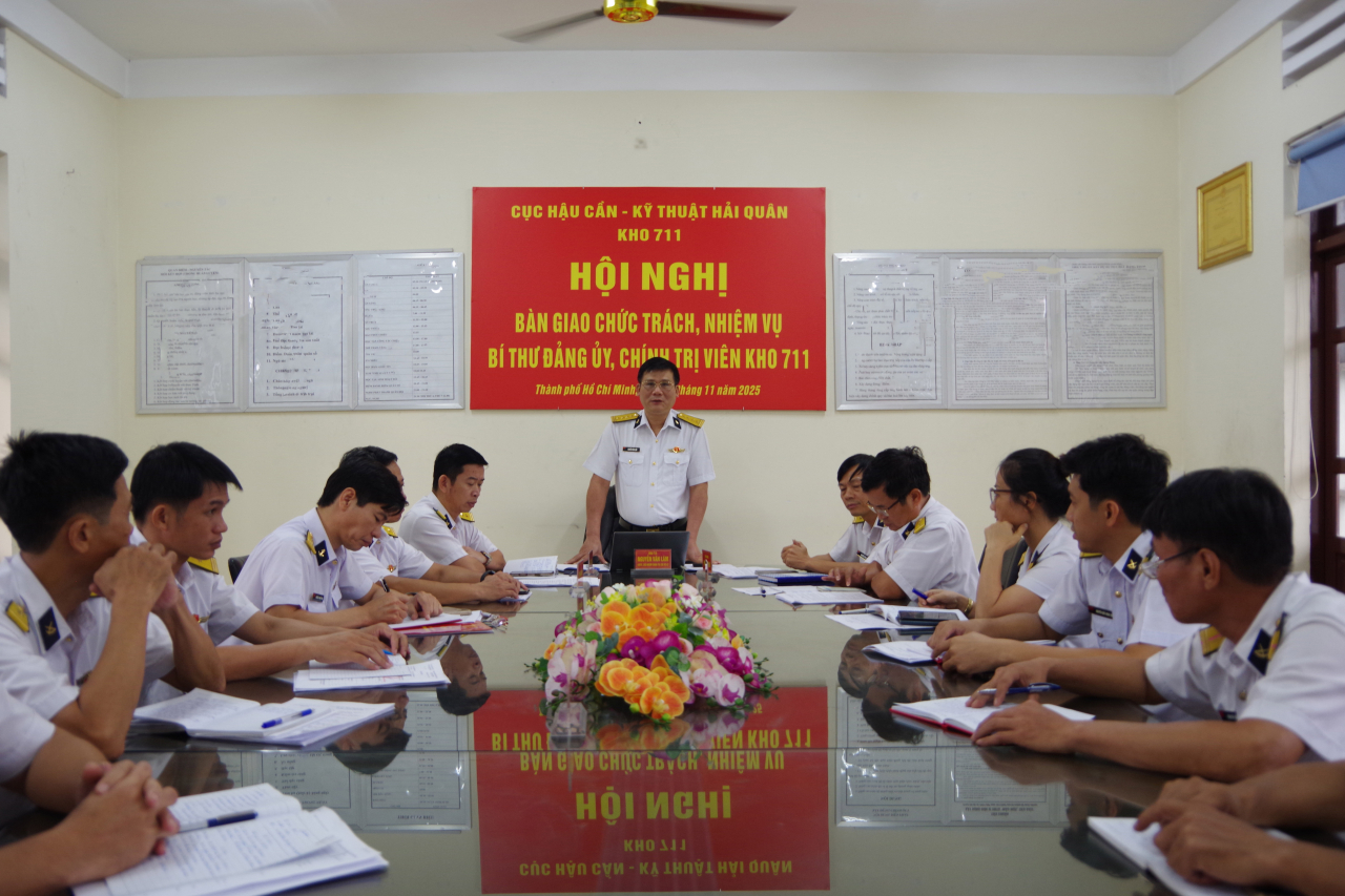 HQ Online - Chiều 13/11, tại TP. Hồ Chí Minh, Kho 711, Cục Hậu cần - Kỹ thuật Hải quân tổ chức Hội nghị bàn giao chức trách, nhiệm vụ Bí thư Đảng ủy, Chính trị viên Kho giữa Thượng tá Nguyễn Xuân Trung và Trung tá Nguyễn Thanh Tĩnh. Đại tá Nguyễn Văn Lâm, Ủy viên Ban Thường vụ Đảng ủy, Chủ nhiệm Chính trị Cục Hậu cần - Kỹ thuật chủ trì.