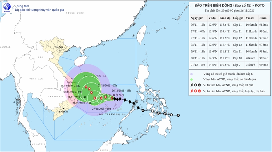 Trong khoảng ngày 27 đến 28/11, khu vực giữa Biển Đông (bao gồm vùng biển phía Bắc đặc khu Trường Sa) có khả năng chịu tác động của gió mạnh cấp 11, giật cấp 14, sóng biển cao 7,0-9,0m, biển động dữ dội.