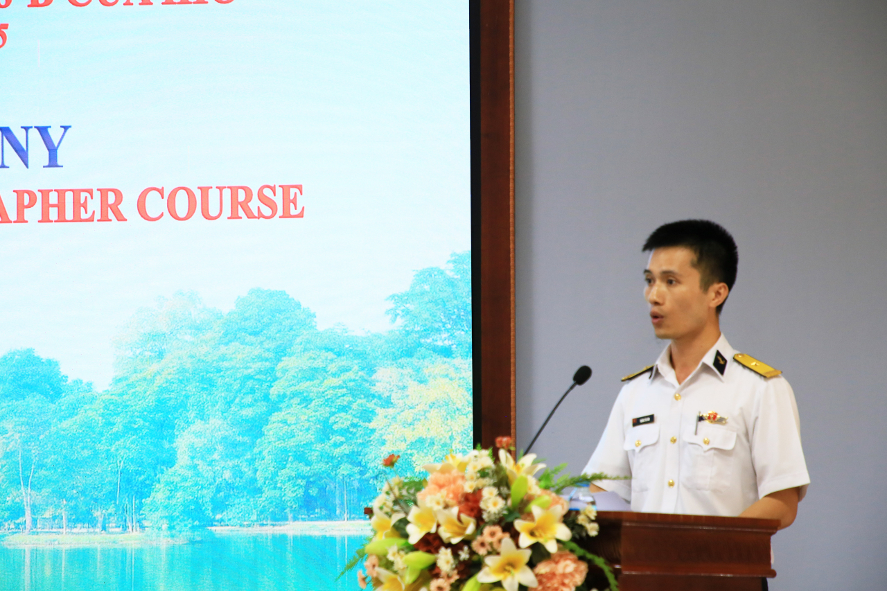 Phát biểu tại buổi lễ, Đại tá Trần Văn Hiếu, Trưởng phòng Thủy đạc, Bộ Tham mưu Hải quân, Phó Chánh Văn phòng Ủy ban Thủy đạc Việt Nam, Trưởng đoàn Việt Nam, chúc mừng các giảng viên và học viên đã hoàn thành xuất sắc chương trình khóa học kéo dài 6 tháng.