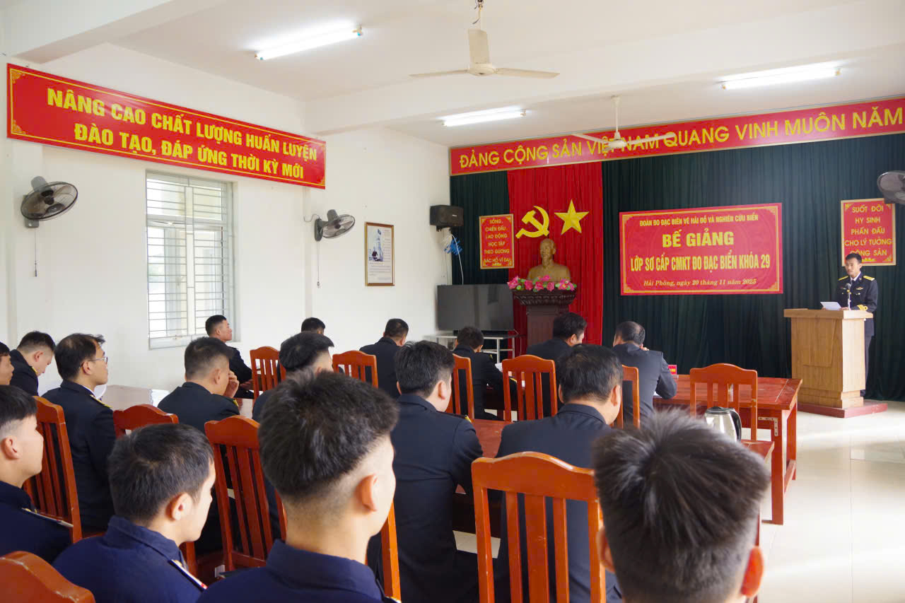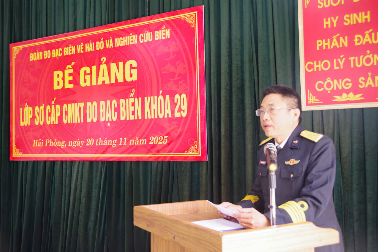 HQ Online - Sáng 20/11, tại Hải Phòng, Đoàn Đo đạc biên vẽ hải đồ và nghiên cứu biển (Bộ Tham mưu Hải quân) tổ chức bế giảng lớp sơ cấp chuyên môn kỹ thuật đo đạc biển Khóa 29 năm 2025. Thượng tá Hoàng Đức Phương, Phó Đoàn trưởng, Tham mưu trưởng dự và chủ trì.
