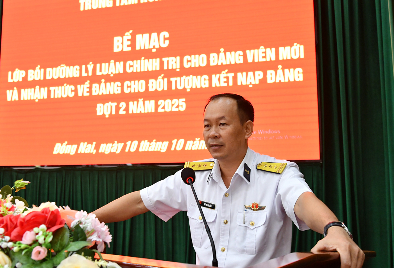 HQ Online - Ngày 10/10, tại tỉnh Đồng Nai, Trung tâm Huấn luyện Vùng 2 Hải quân tổ chức bế mạc lớp bồi dưỡng lý luận chính trị cho đảng viên mới và lớp nhận thức về Đảng dành cho đối tượng kết nạp Đảng đợt 2 năm 2025. Thượng tá Vũ Mạnh Hòa, Bí thư Đảng ủy, Chính ủy Trung tâm chủ trì.
