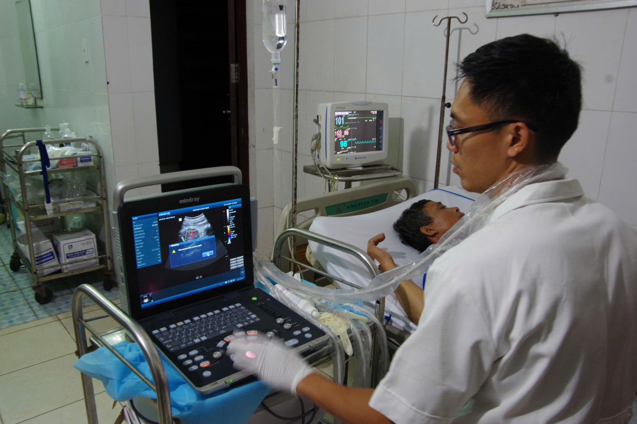 Kíp y, bác sĩ Bệnh xá đảo Trường Sa đã nhanh chóng thăm khám và chẩn đoán bệnh nhân viêm bàng quang xuất huyết, chưa loại trừ xuất huyết nang thận phải.
