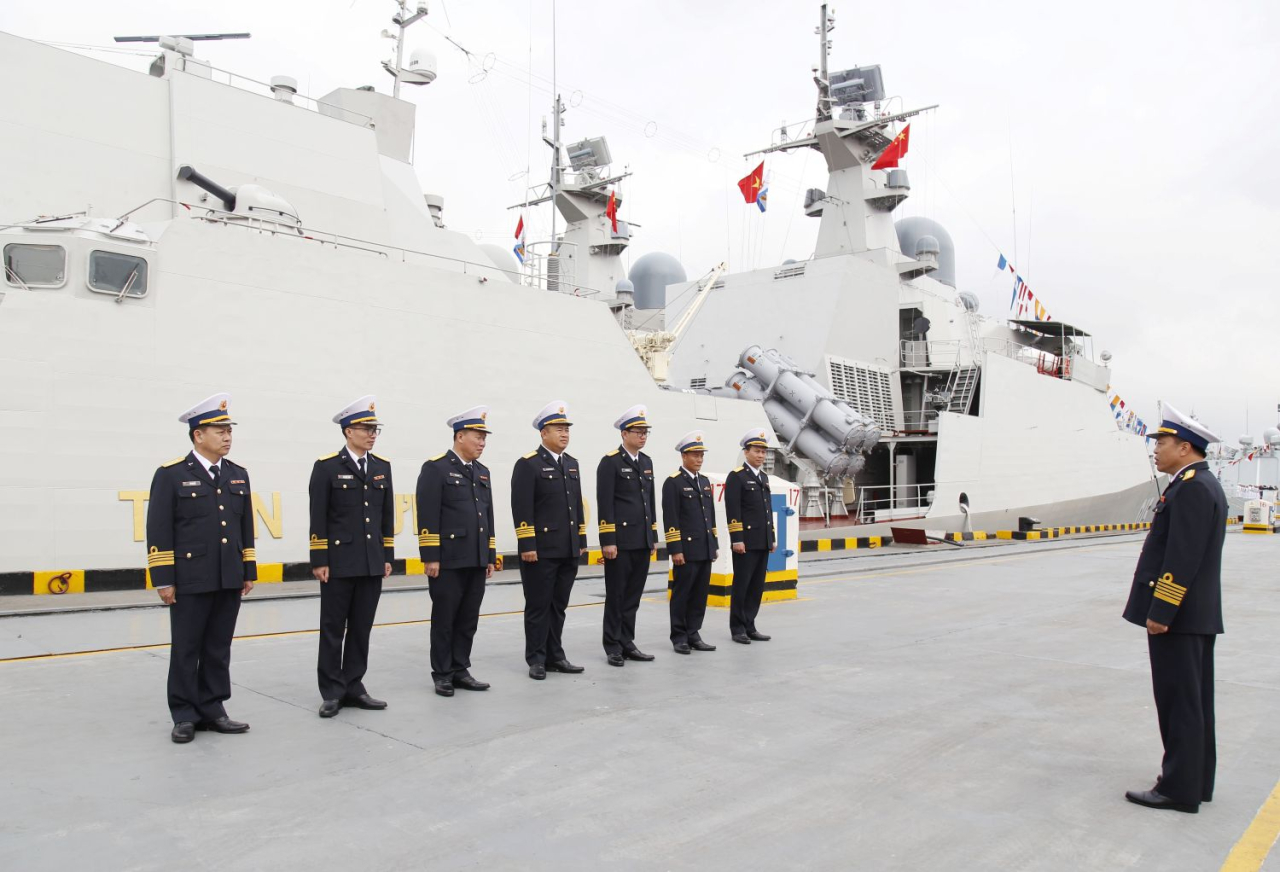 HQ Online - Trong khuôn khổ Giao lưu hữu nghị quốc phòng biên giới Việt Nam-Trung Quốc lần thứ 10, sáng 18/3, tại cảng Phòng Thành (Quảng Tây, Trung Quốc), đoàn công tác Hải quân nhân dân Việt Nam cùng sĩ quan, thủy thủ Biên đội Tàu 015-Trần Hưng Đạo, Tàu 012-Lý Thái Tổ tổng duyệt nội dung đón Bộ trưởng Bộ Quốc phòng hai nước đến chứng kiến Lễ khởi hành tuần tra liên hợp lần thứ 40, huấn luyện liên hợp trên vùng biển Vịnh Bắc Bộ.