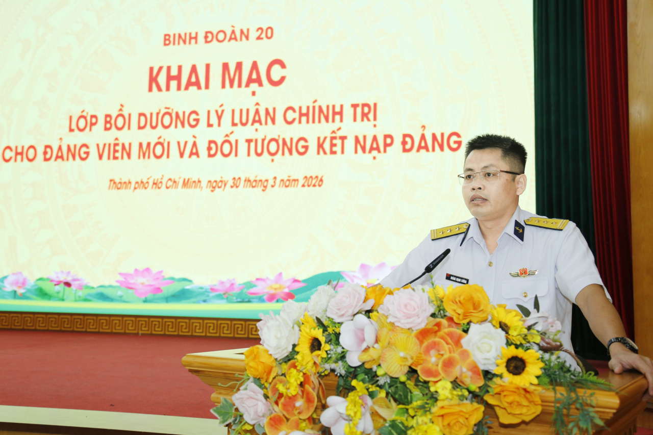HQ Online - Sáng 30/3, tại TP. Hồ Chí Minh, Binh đoàn 20-Tổng công ty Tân cảng Sài Gòn tổ chức lớp bồi dưỡng lý luận chính trị cho đảng viên mới và đối tượng đảng năm 2026. Thượng tá Hoàng Mạnh Cường, Phó Chủ nhiệm Chính trị Binh đoàn dự, phát biểu khai mạc.