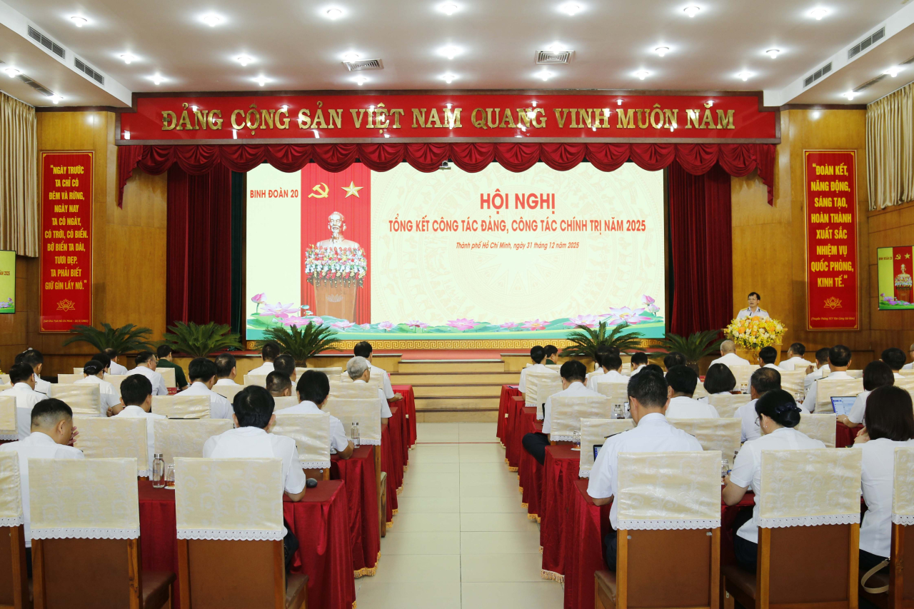 HQ Online - Chiều 31/12, tại TP. Hồ Chí Minh, Binh đoàn 20 - Tổng công ty Tân cảng Sài Gòn tổ chức Hội nghị tổng kết công tác đảng, công tác chính trị (CTĐ, CTCT) năm 2025. Đại tá Nguyễn Năng Toàn, Bí thư Đảng ủy, Phó Tư lệnh Binh đoàn chủ trì. Tham dự có đại diện các cơ quan chức năng Tổng cục Chính trị QĐND Việt Nam, thủ trưởng Binh đoàn và chỉ huy các cơ quan, đơn vị, các tổ chức quần chúng trong hệ thống.