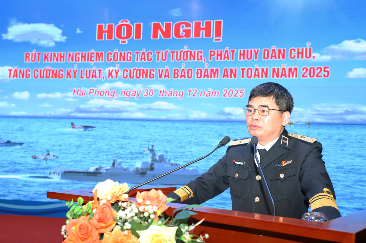 Tại hội nghị, Đại tá Phạm Khoa Nam, Chủ nhiệm Chính trị Bộ Tham mưu thông báo kết luận của Chính ủy Quân chủng Hải quân tại hội nghị rút kinh nghiệm toàn Quân chủng và Báo cáo kết quả công tác tư tưởng, phát huy dân chủ, tăng cường kỷ luật, kỷ cương và bảo đảm an toàn trong Bộ Tham mưu năm 2025.