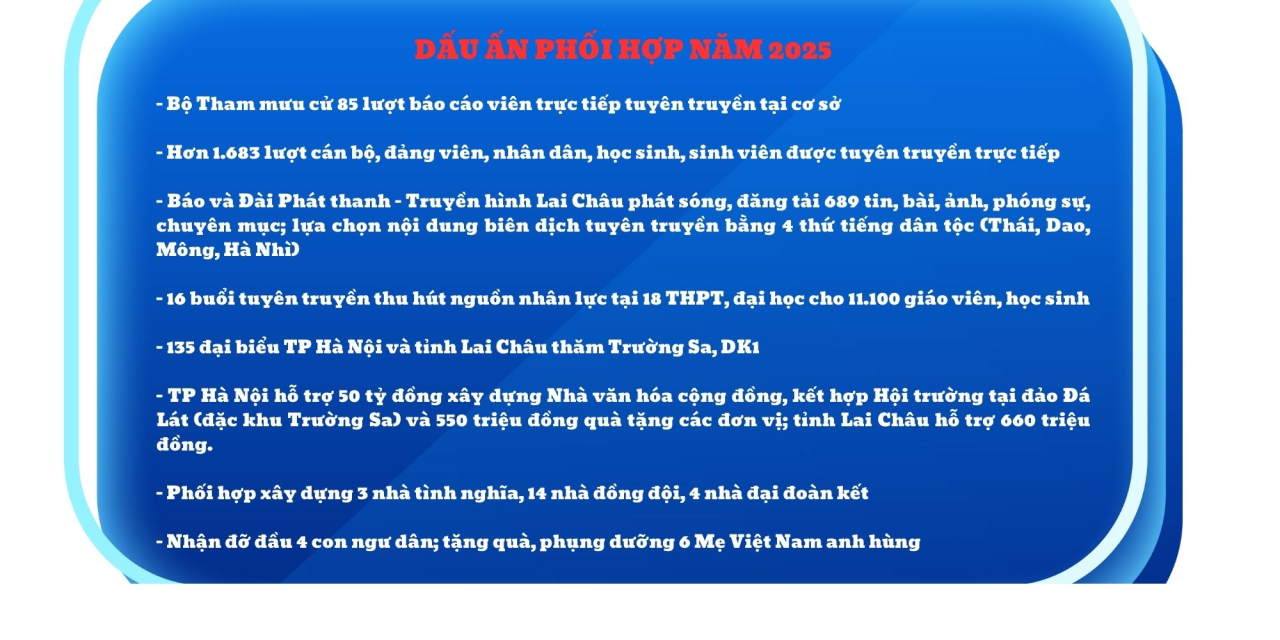 Đại diện Ban TG&DV Tỉnh ủy Lai Châu nhấn mạnh, dù là địa phương miền núi, không giáp biển, song các hoạt động hướng về biển đảo luôn nhận được sự hưởng ứng nhiệt tình của đồng bào các dân tộc; nhiều chương trình ủng hộ Trường Sa, DK1 đã để lại dấu ấn sâu sắc, góp phần gắn kết hậu phương với tiền tiêu Tổ quốc.