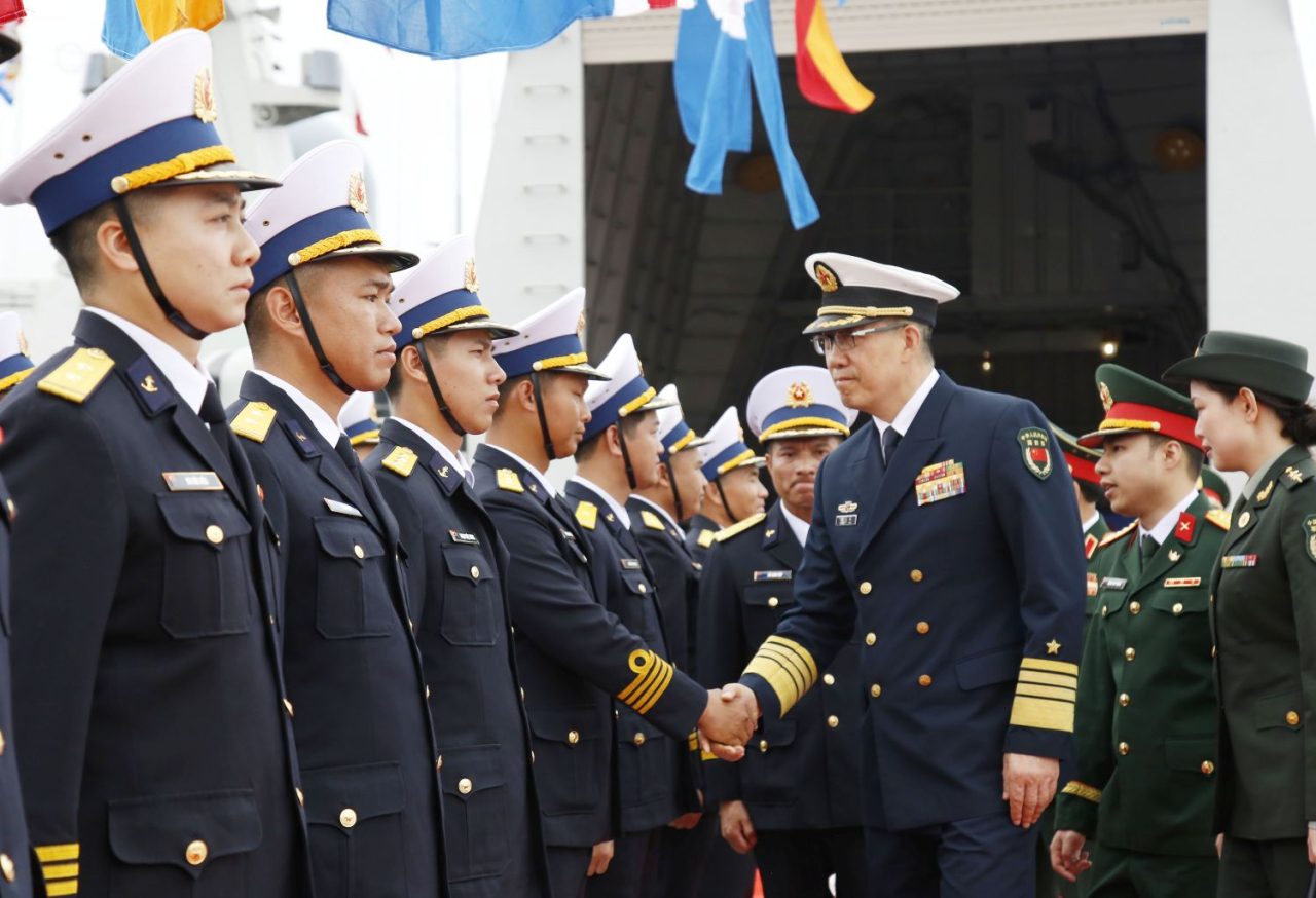 Cán bộ, chiến sĩ Tàu 015 và đoàn công tác Hải quân nhân dân Việt Nam đón Thượng tướng Đổng Quân