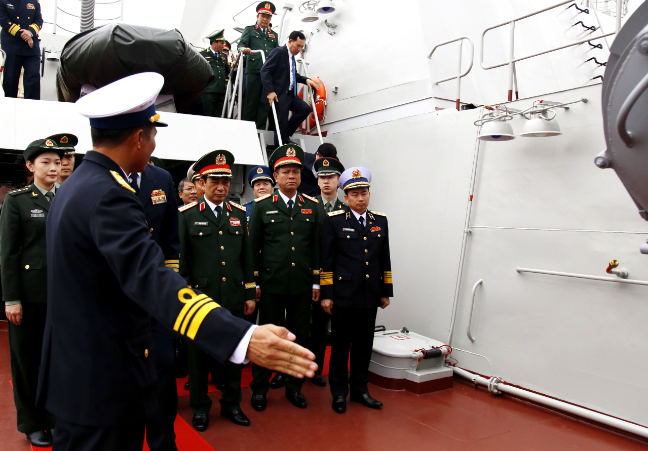 Đại tướng Phan Văn Giang và Thượng tướng Đổng Quân cùng đoàn đại biểu Bộ Quốc phòng hai nước tham quan Tàu 015