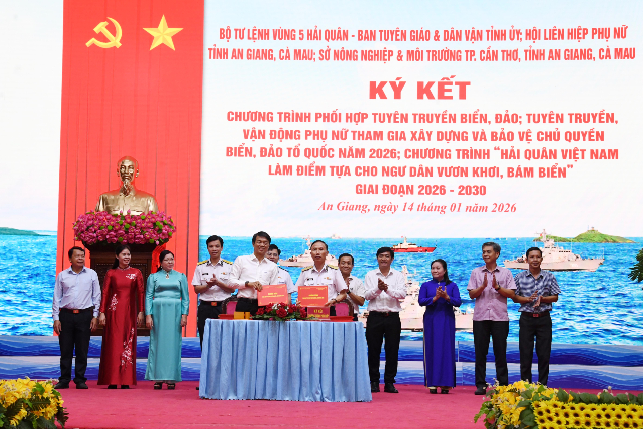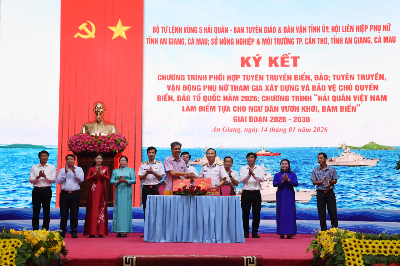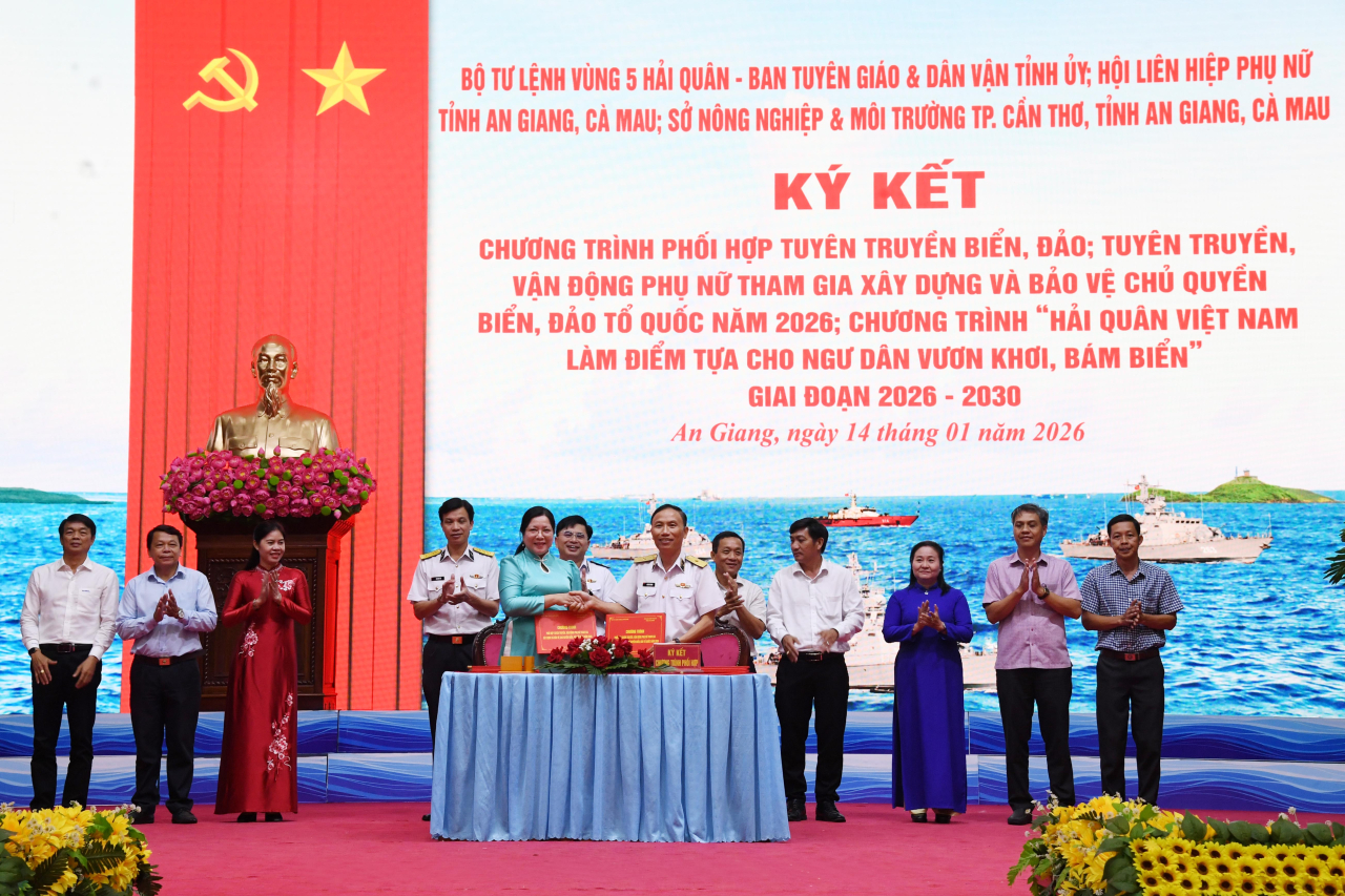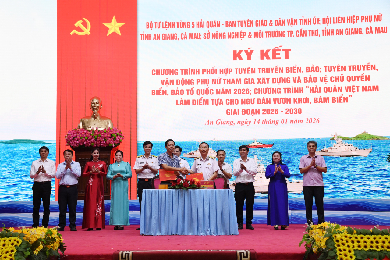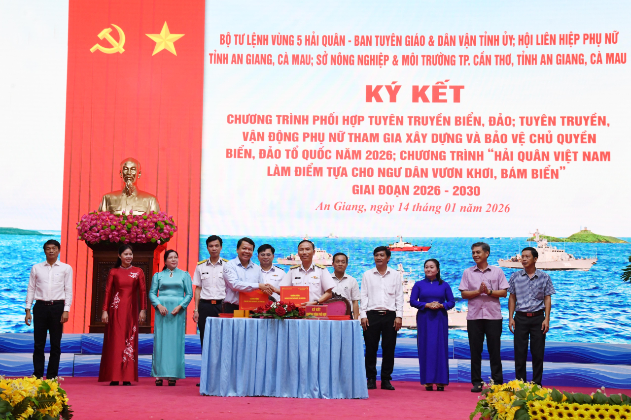 Tại hội nghị, Bộ Tư lệnh Vùng 5 Hải quân đã ký kết chương trình phối hợp tuyên truyền biển đảo; tuyên truyền, vận động phụ nữ tham gia xây dựng và bảo vệ chủ quyền biển đảo Tổ quốc năm 2026 với Ban Tuyên giáo và Dân vận Tỉnh ủy, Hội Liên hiệp phụ nữ tỉnh An Giang, tỉnh Cà Mau; đồng thời ký kết chương trình “Hải quân Việt Nam làm điểm tựa cho ngư dân vươn khơi, bám biển” giai đoạn 2026 - 2030 với Sở Nông nghiệp và Môi trường TP. Cần Thơ, tỉnh An Giang và Cà Mau.