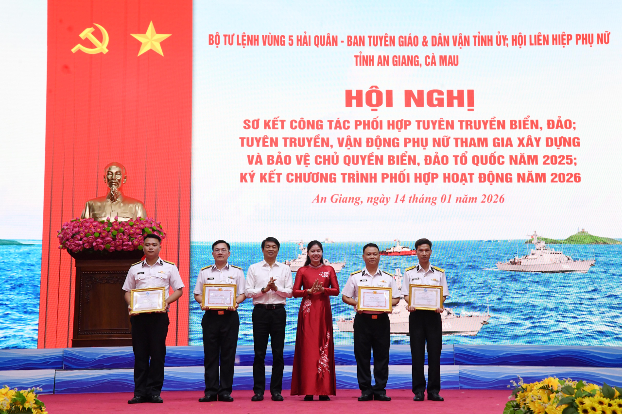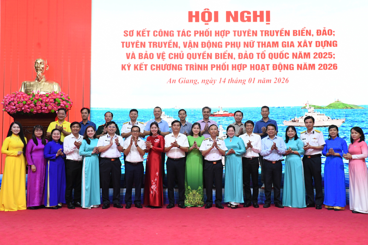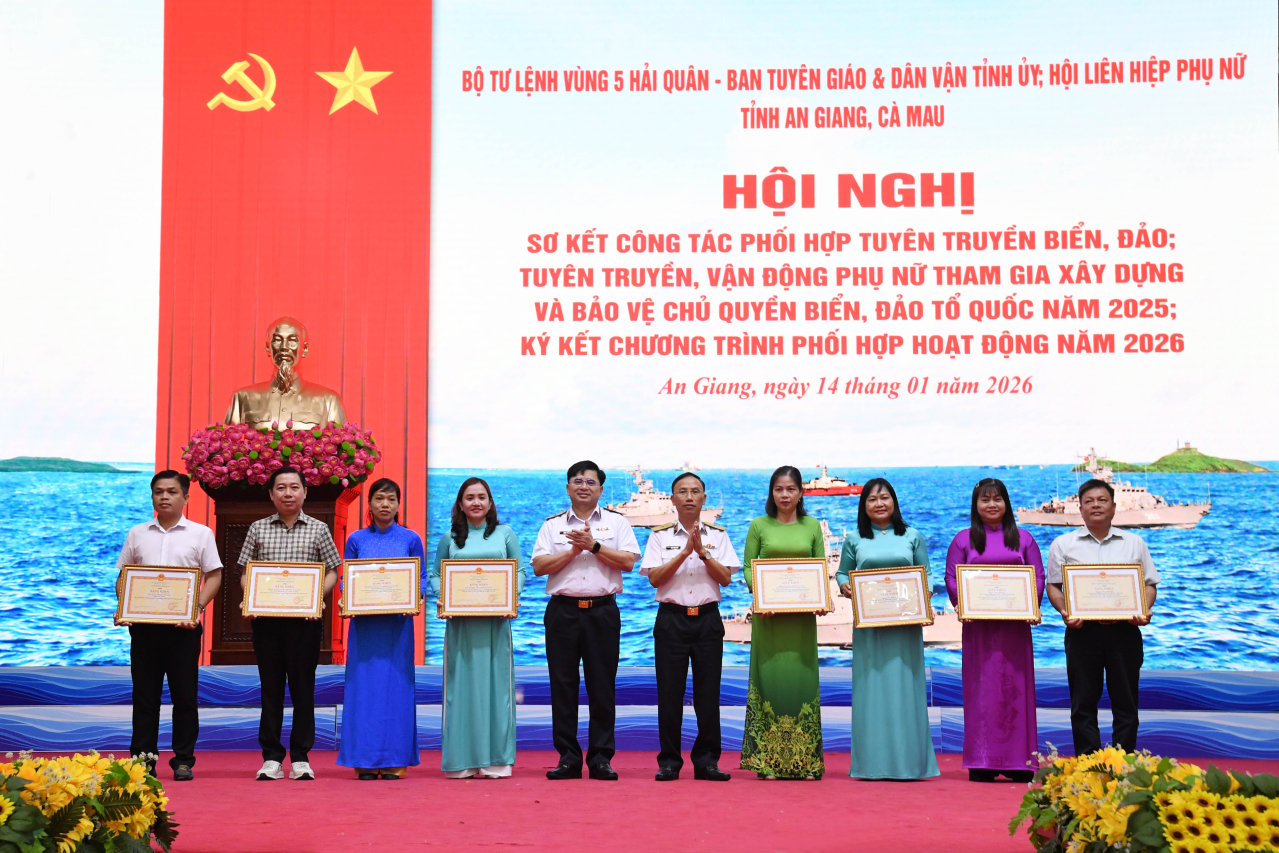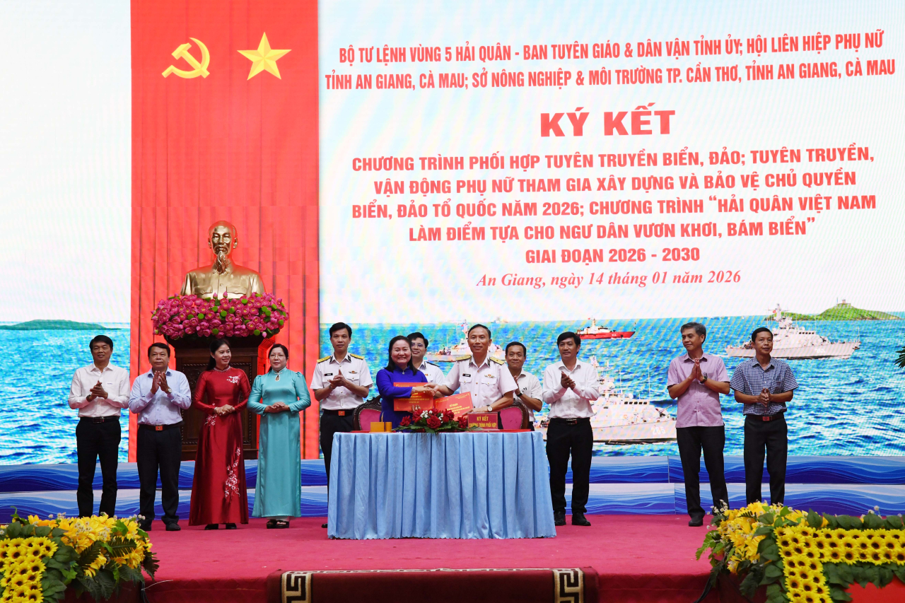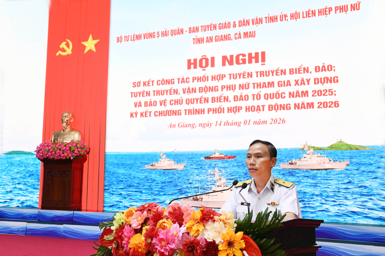 HQ Online - Chiều 14/1, tại đặc khu Phú Quốc (tỉnh An Giang), Bộ Tư lệnh Vùng 5 Hải quân chủ trì phối hợp với Ban Tuyên giáo và Dân vận Tỉnh ủy, Hội Liên hiệp phụ nữ tỉnh An Giang, tỉnh Cà Mau tổ chức Hội nghị sơ kết công tác phối hợp tuyên truyền biển đảo; tuyên truyền, vận động phụ nữ tham gia xây dựng, bảo vệ chủ quyền biển đảo Tổ quốc năm 2025; ký kết chương trình phối hợp hoạt động năm 2026. Đại tá Bùi Đình Tiệp, Phó Chủ nhiệm Chính trị Hải quân dự, chỉ đạo. Chuẩn Đô đốc Ngô Văn Thành, Chính ủy Vùng 5 Hải quân chủ trì.