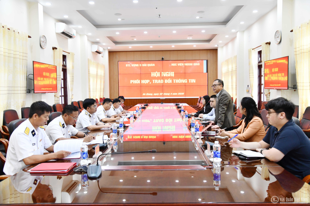 HQ Online - Ngày 2/4, tại đặc khu Phú Quốc, tỉnh An Giang, Bộ Tư lệnh Vùng 5 Hải quân và Học viện Ngoại giao tổ chức Hội nghị phối hợp, trao đổi thông tin về tình hình biển đảo. Chuẩn Đô đốc Trịnh Xuân Tùng, Tư lệnh Vùng 5 Hải quân và Tiến sĩ Đỗ Thanh Hải, Phó Viện trưởng Viện Biển Đông, Học viện Ngoại giao đồng chủ trì.