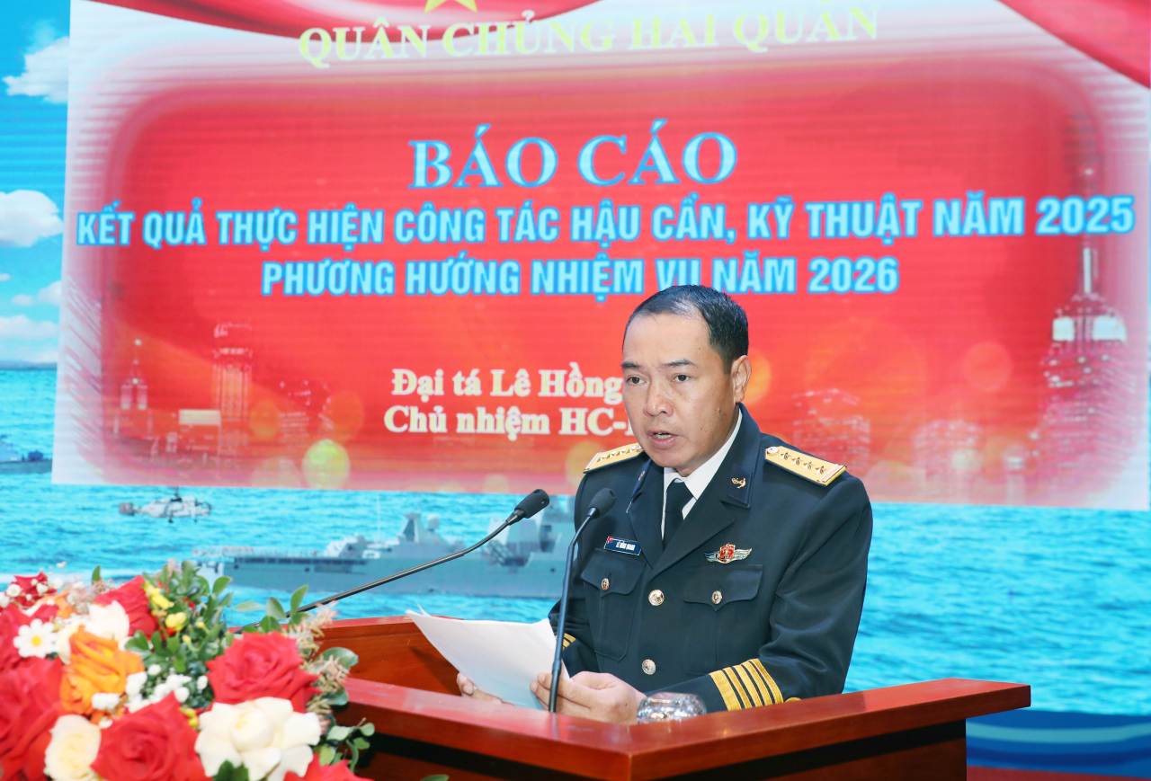 Báo cáo do Đại tá Lê Hồng Quang, Chủ nhiệm HC - KT Hải quân trình bày tại hội nghị cho biết, năm 2025, Ngành hậu cần HC – KT đã bám sát kế hoạch, chỉ lệnh các cấp, bảo đảm đầy đủ, kịp thời mọi mặt về HC, KT cho các nhiệm vụ của Quân chủng, một số nhiệm vụ hoàn thành xuất sắc như: bảo đảm cho lực lượng trực, huấn luyện chiến đấu, sẵn sàng chiến đấu, tham gia A50, A80, Lễ kỷ niệm 70 năm thành lập Hải quân nhân dân Việt Nam, Đại hội đại biểu Đảng bộ Quân chủng lần thứ XIV; tiếp nhận, huấn luyện chiến sĩ mới…