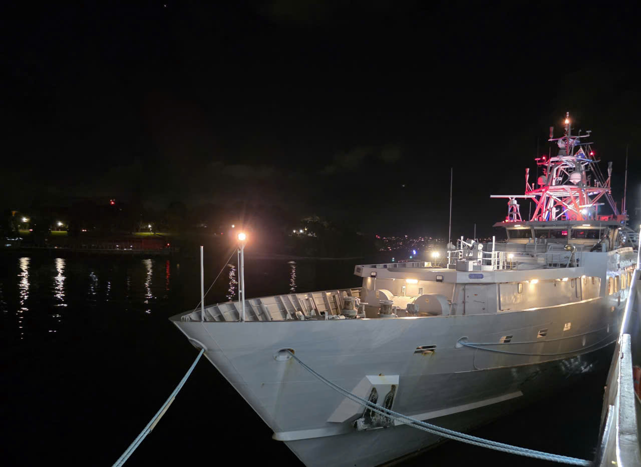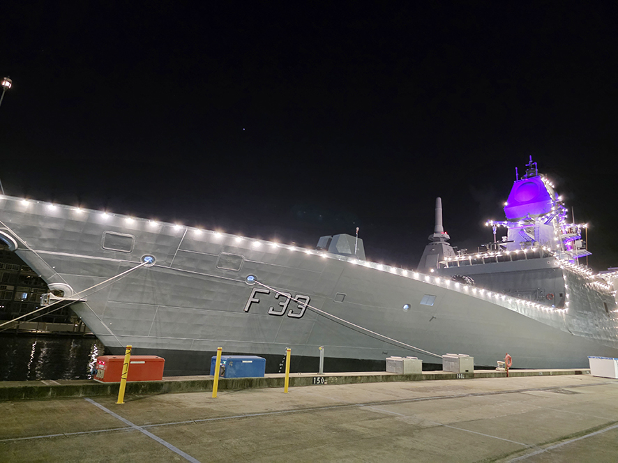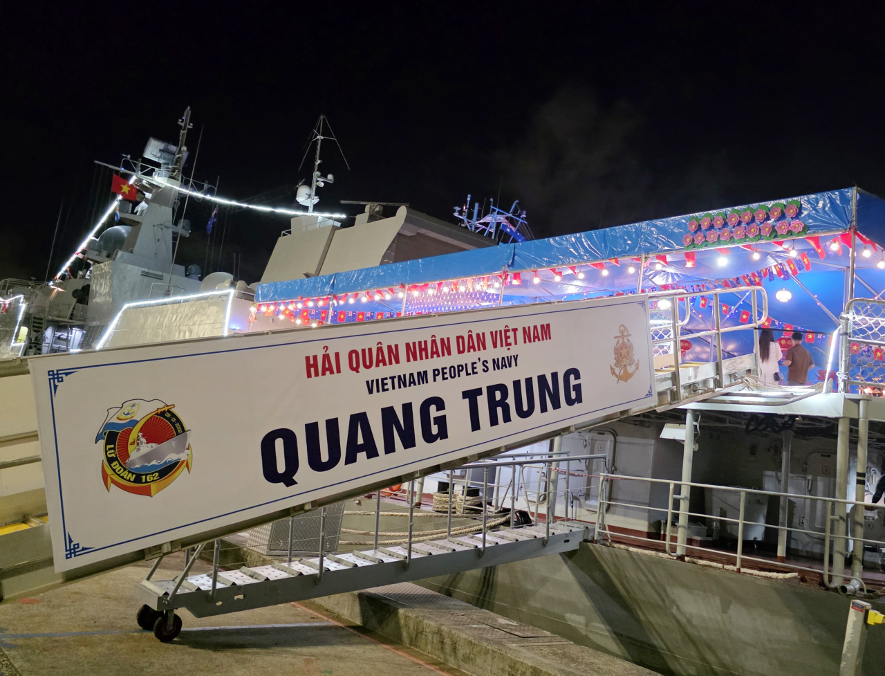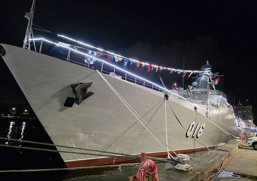 Tàu 016-Quang Trung của Hải quân Việt Nam được trang hoàng cờ đầy, đèn led từ phía mũi đến phía lái