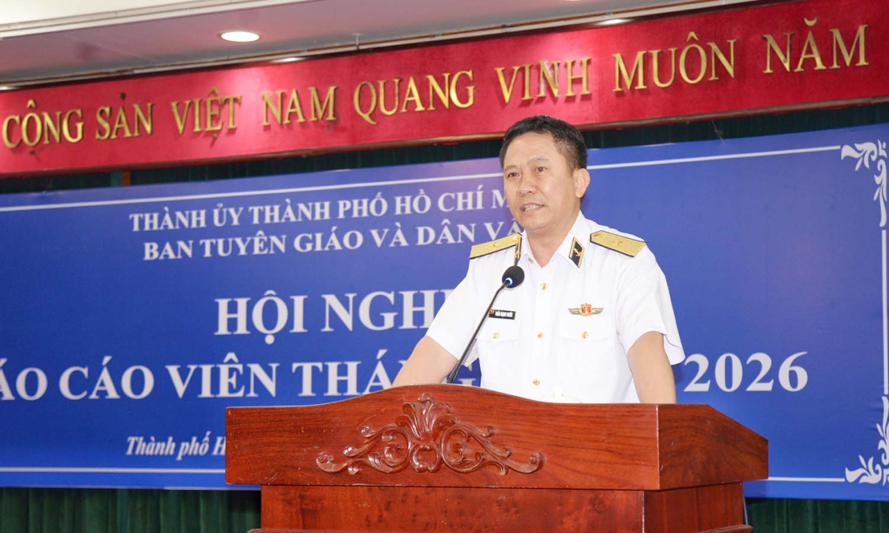 HQ Online - Sáng 5/3, tại Trung tâm Hội nghị phường Xuân Hòa, TP. Hồ Chí Minh, Chuẩn Đô đốc Trần Mạnh Chiến, Chính ủy Vùng 2 Hải quân thông tin chuyên đề tại Hội nghị Báo cáo viên Thành phố tháng 3/2026. Hội nghị do Ban Tuyên giáo và Dân vận Thành ủy TP. Hồ Chí Minh tổ chức, kết nối trực tuyến đến 66 điểm cầu trên địa bàn thành phố.