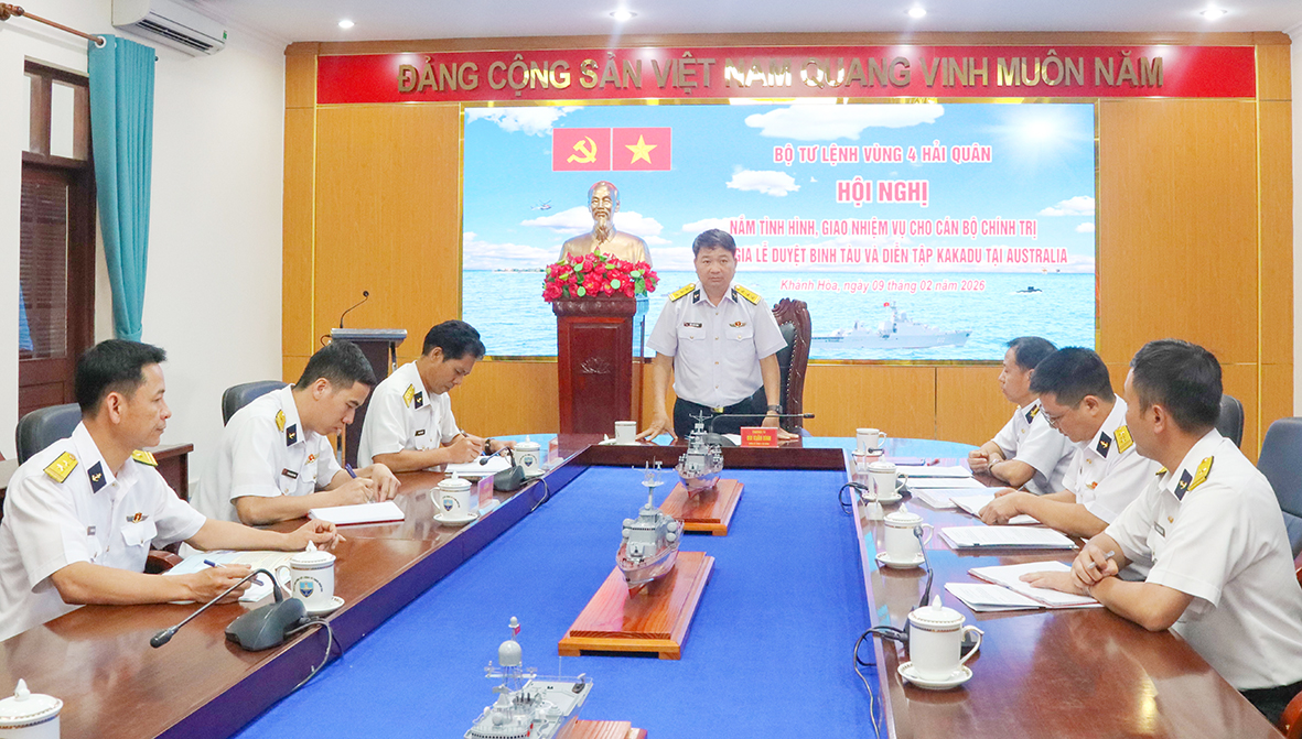 HQ Online - Ngày 9/2, tại phường Bắc Cam Ranh, tỉnh Khánh Hòa, Thượng tá Bùi Xuân Bình, Bí thư Đảng ủy, Chính ủy Vùng 4 Hải quân đã nắm tình hình, giao nhiệm vụ cho cán bộ chính trị tham gia Lễ duyệt binh tàu quốc tế và Diễn tập Kakadu-2026 tại Australia.