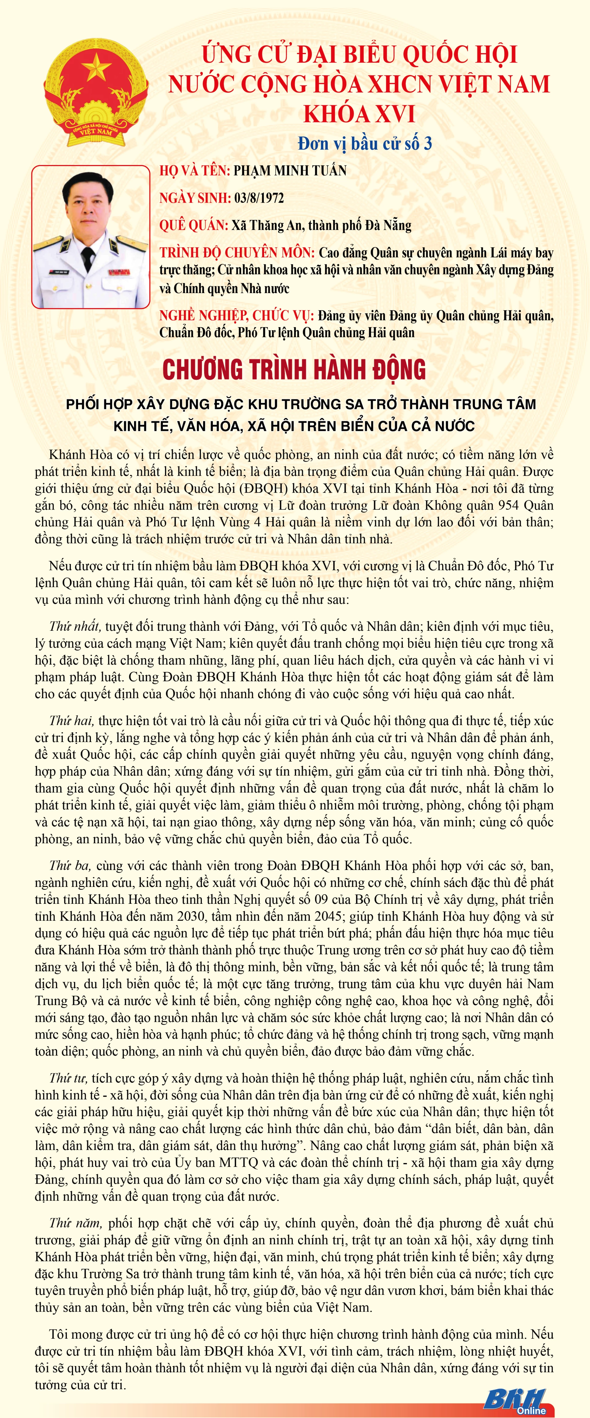 Báo Hải quân Việt Nam trân trọng dẫn nguồn giới thiệu chương trình hành động của Chuẩn Đô đốc Phạm Minh Tuấn, Phó Tư lệnh Hải quân - ứng cử đại biểu Quốc hội khóa XVI tại Khánh Hòa, đơn vị bầu cử số 3.