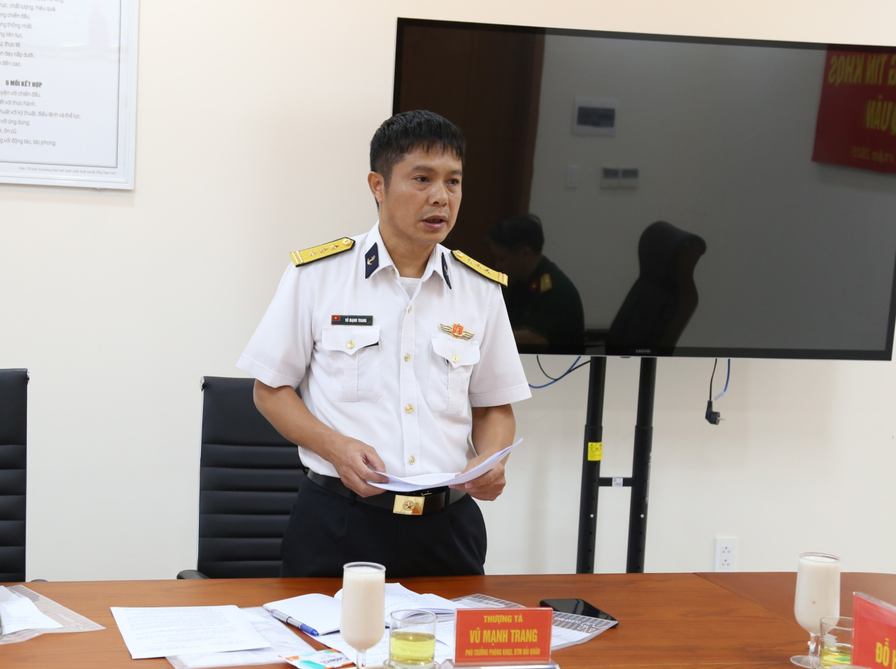 Thượng tá Vũ Mạnh Trang, Phó trưởng phòng Khoa học Quân sự (Bộ Tham mưu Hải quân) báo cáo kết quả thực hiện công tác TTKHQS giai đoạn 2023-2025.