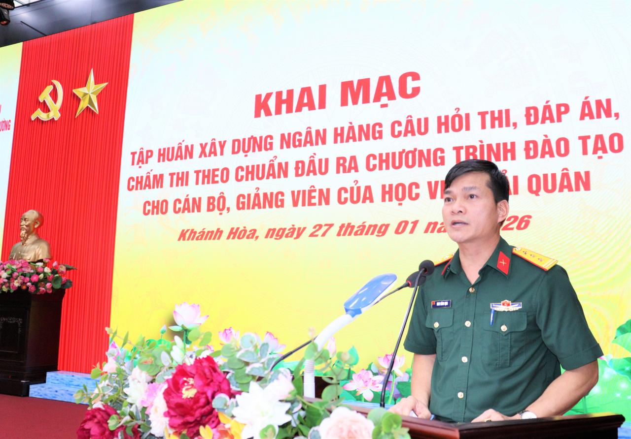 HQ Online - Sáng 27/1, tại Học viện Hải quân, Cục Quân huấn-Nhà trường, Bộ Tổng Tham mưu tổ chức khai mạc lớp tập huấn xây dựng ngân hàng câu hỏi, đáp án chấm thi theo chuẩn đầu ra cho cán bộ, giảng viên các trường quân đội năm 2026. Đại tá, PGS, TS Lại Hồng Đông, Phó Giám đốc Học viện dự.
