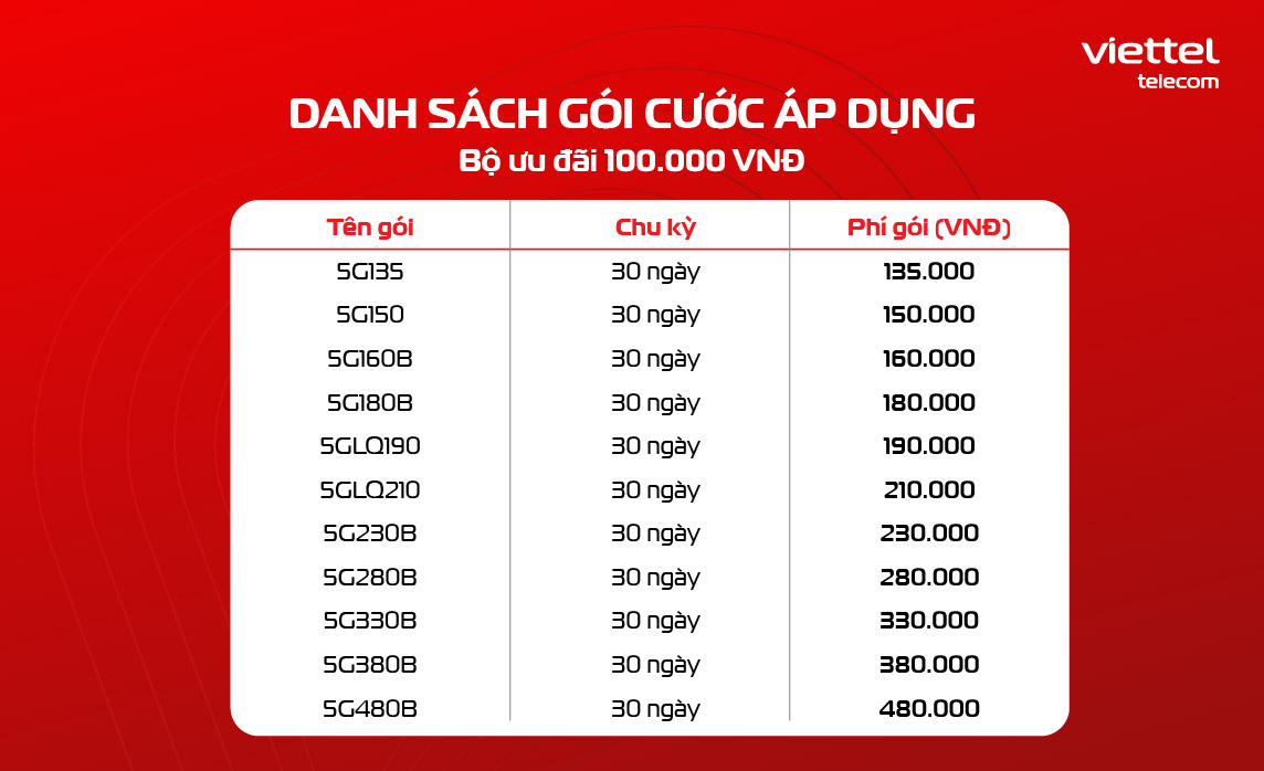 Danh sách gói cước 5G dành cho thuê bao trả sau áp dụng bộ ưu đãi 100.000 VNĐ