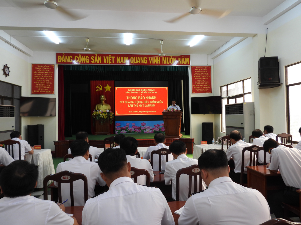 HQ Online - Ngày 5/2/, Đảng ủy Công ty Hải sản Trường Sa (Hải đoàn 129 Hải quân) tổ chức hội nghị thông báo nhanh kết quả Đại hội đại biểu toàn quốc lần thứ XIV của Đảng. Thượng tá Bùi Ngọc Sang, Bí thư Đảng ủy Công ty, Chính ủy Hải đoàn chủ trì và trực tiếp phổ biến, quán triệt nội dung.