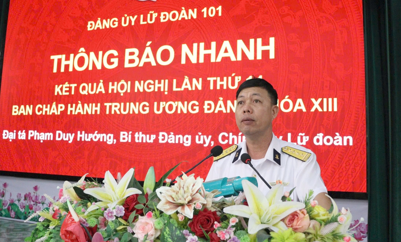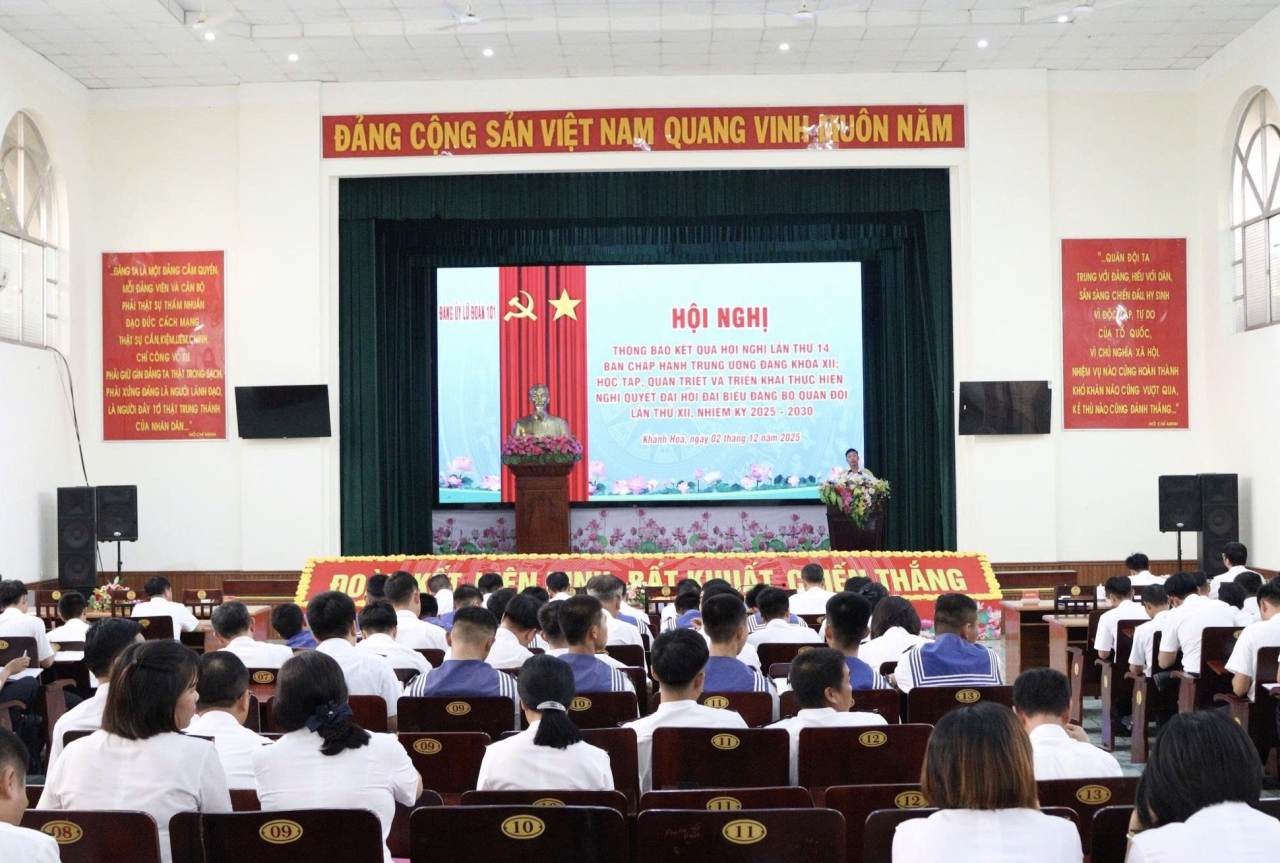 HQ Online - Chiều 2/12, tại xã Cam Lâm, tỉnh Khánh Hòa, Đảng ủy Lữ đoàn 101 (Vùng 4 Hải quân) tổ chức thông báo nhanh kết quả Hội nghị lần thứ 14 Ban Chấp hành Trung ương Đảng khóa XIII; học tập, quán triệt và triển khai thực hiện Nghị quyết Đại hội đại biểu Đảng bộ Quân đội lần thứ XII nhiệm kỳ 2025 - 2030. Đại tá Phạm Duy Hướng, Bí thư Đảng ủy, Chính ủy Lữ đoàn chủ trì hội nghị.