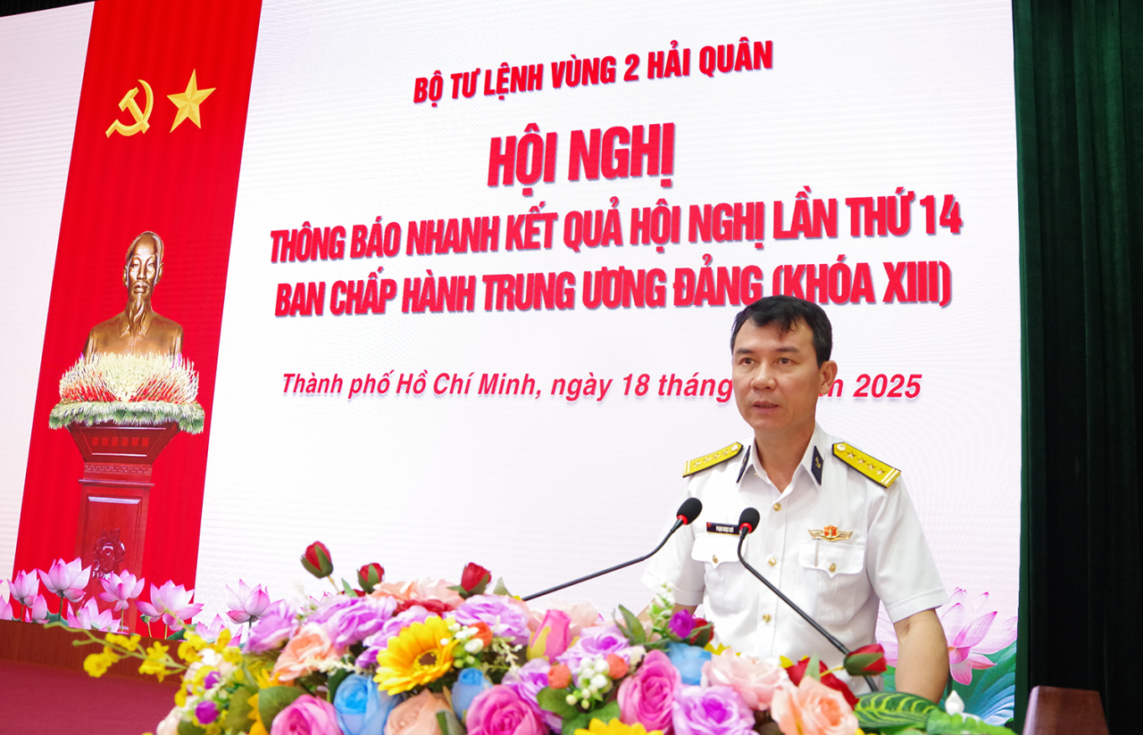 HQ Online - Sáng 18/11, tại xã Long Sơn (TP Hồ Chí Minh), Ban Thường vụ Đảng ủy Vùng 2 Hải quân tổ chức Hội nghị thông báo nhanh kết quả Hội nghị lần thứ 14, Ban Chấp hành Trung ương Đảng khóa XIII. Đại tá Phạm Ngọc Quý, Ủy viên Ban Thường vụ Đảng ủy, Chủ nhiệm Chính trị Vùng 2 dự và trực tiếp quán triệt.