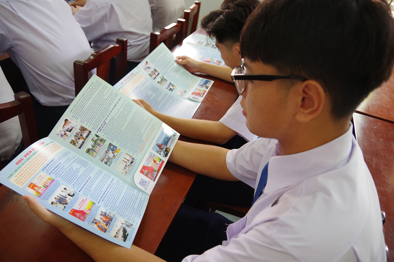Học sinh tìm hiểu thông tin qua tờ rơi