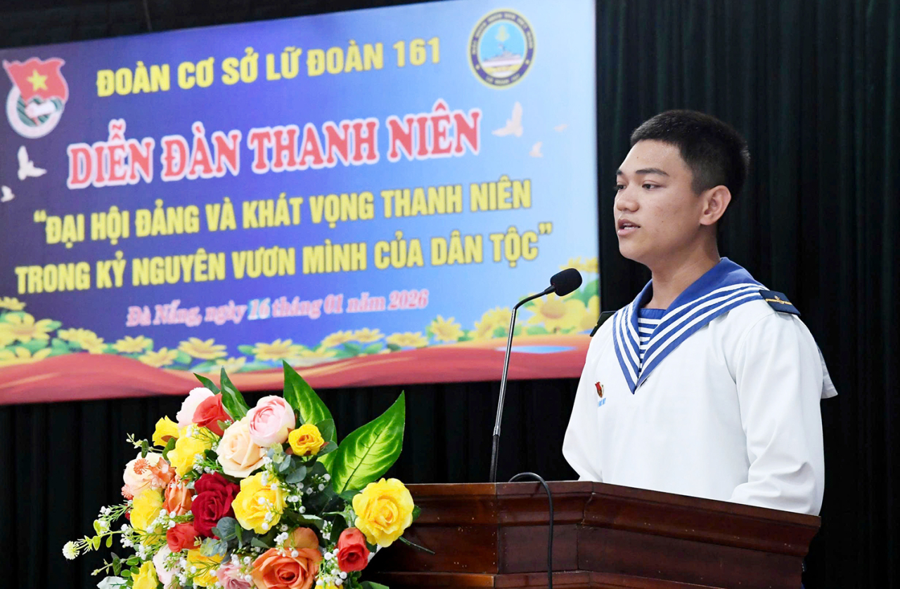HQ Online - Tối 16/1, tại TP. Đà Nẵng, Đoàn cơ sở Lữ đoàn 161, Vùng 3 Hải quân tổ chức diễn đàn thanh niên với chủ đề “Đại hội Đảng và khát vọng thanh niên trong kỷ nguyên vươn mình của dân tộc”. Thượng tá Nguyễn Ngọc Nguyên, Phó Chính ủy Lữ đoàn dự, động viên.