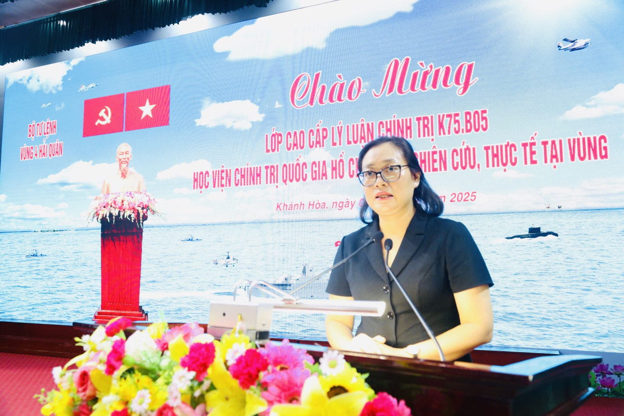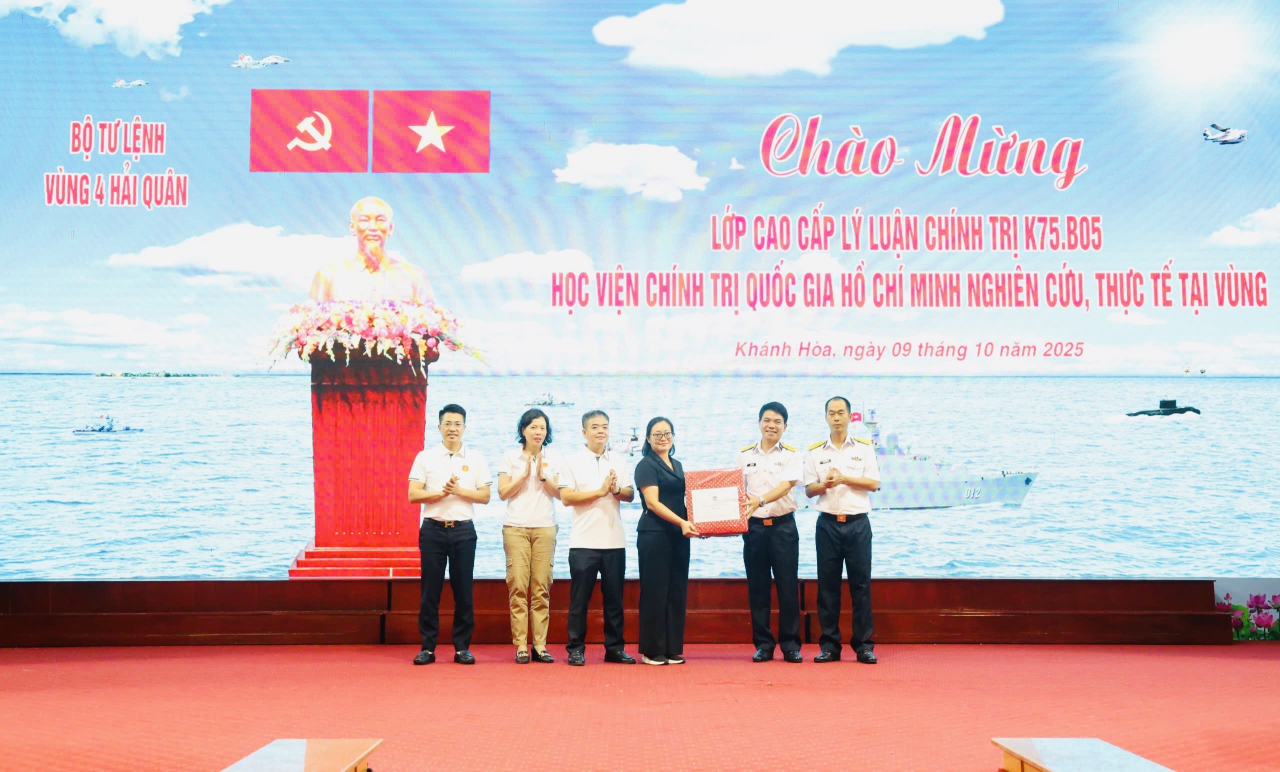 HQ Online - Sáng 9/10, đoàn cán bộ Học viện Chính trị quốc gia Hồ Chí Minh do TS Nguyễn Thị Thùy Linh, Chủ nhiệm lớp, làm trưởng đoàn đến tham quan, tìm hiểu thực tế và nghe thông tin về biển đảo tại Vùng 4 Hải quân. Đại tá Nguyễn Hữu Minh, Phó Chính ủy Vùng chủ trì tiếp đoàn.