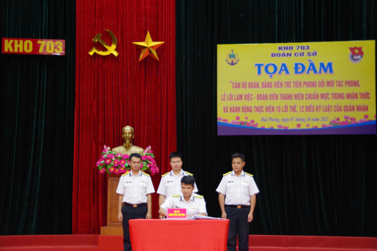HQ Online - Tối 7/10, tại thành phố Hải Phòng, Đoàn cơ sở Kho 703, Vùng 1 Hải quân tổ chức tọa đàm với chủ đề: “Cán bộ Đoàn, đảng viên trẻ tiên phong đổi mới tác phong, lề lối làm việc - Đoàn viên thanh niên chuẩn mực trong nhận thức và hành động thực hiện 10 lời thề, 12 điều kỷ luật của quân nhân.”