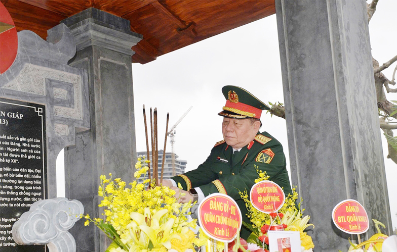 Trước anh linh Đại tướng, đồng chí Bộ trưởng Quốc phòng và đoàn công tác đã dành phút mặc niệm, bày tỏ lòng biết ơn vô hạn đối với những hy sinh to lớn của các thế hệ đi trước cho sự nghiệp xây dựng, bảo vệ Tổ quốc.