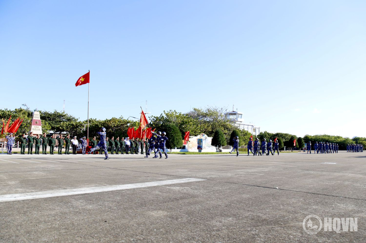 Thủ trưởng đoàn công tác tham gia Lễ chào cờ, duyệt đội ngũ và chụp ảnh lưu niệm trên đảo Trường Sa