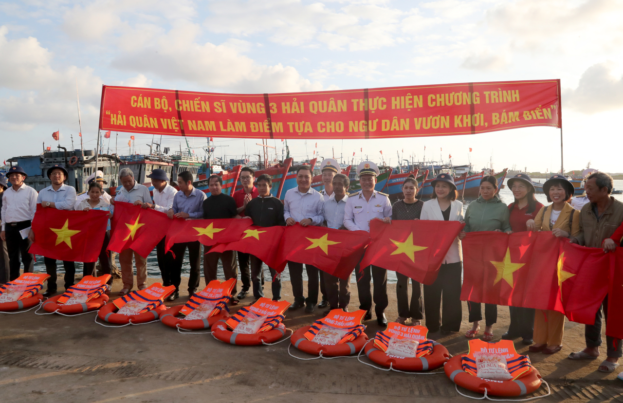 Dịp này, đoàn công tác Vùng 3 trao tặng 15 suất quà cho ngư dân đặc khu Lý Sơn. Đây là nội dung trong Chương trình “Hải quân Việt Nam làm điểm tựa cho ngư dân vươn khơi, bám biển”.