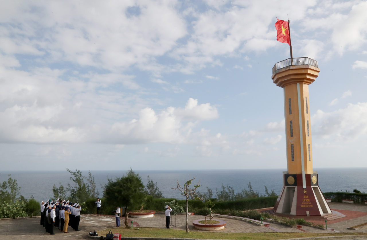Đoàn công tác và các lực lượng thực hiện hiện nghi lễ chào cờ trên đảo Lý Sơn